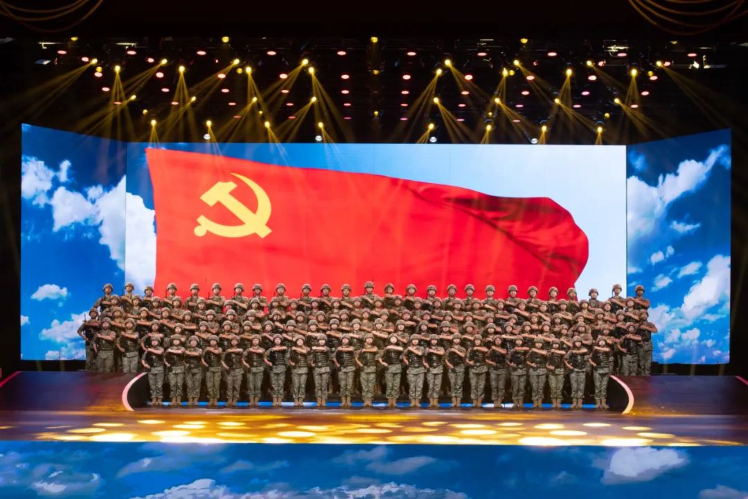 晚会在大合唱《在党的旗帜下前进》中落下帷幕,热烈的掌声经久不息。这掌声,既是在致敬精彩表演,更是在致敬光辉岁月。“向着星辰大海奔去,那是我们心中的高地!”晚会结束,而科大人为军向战、奋进一流,鼎力支撑强军兴军伟业的脚步永不停止!