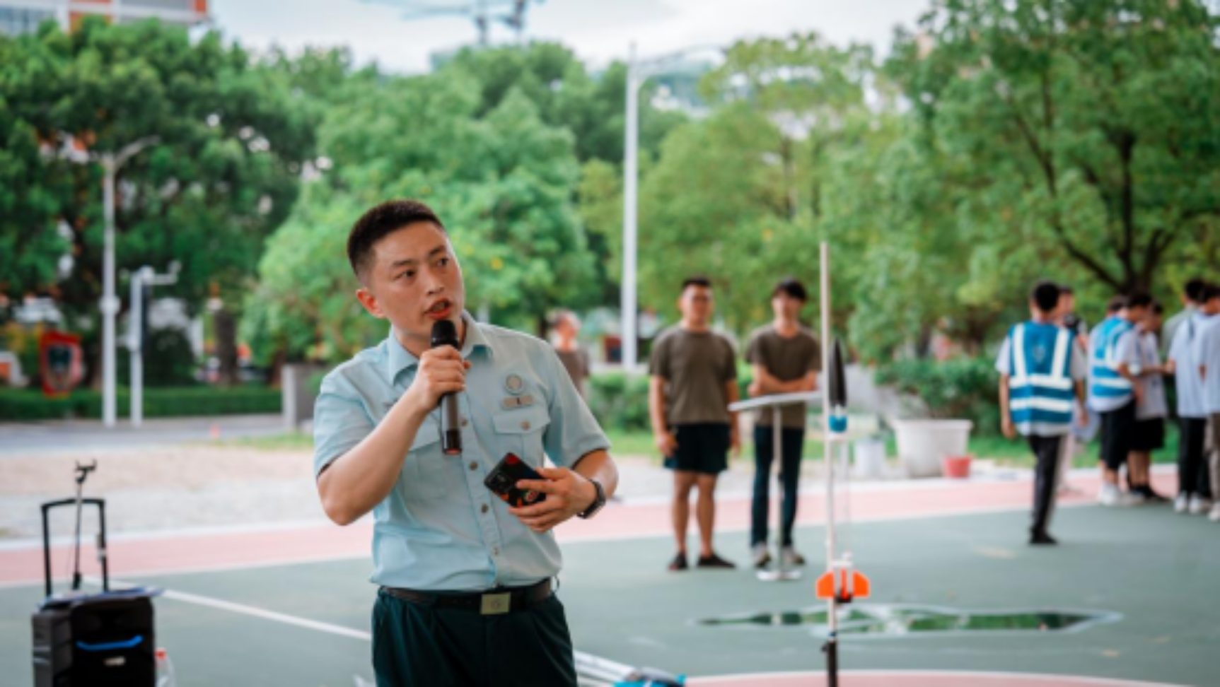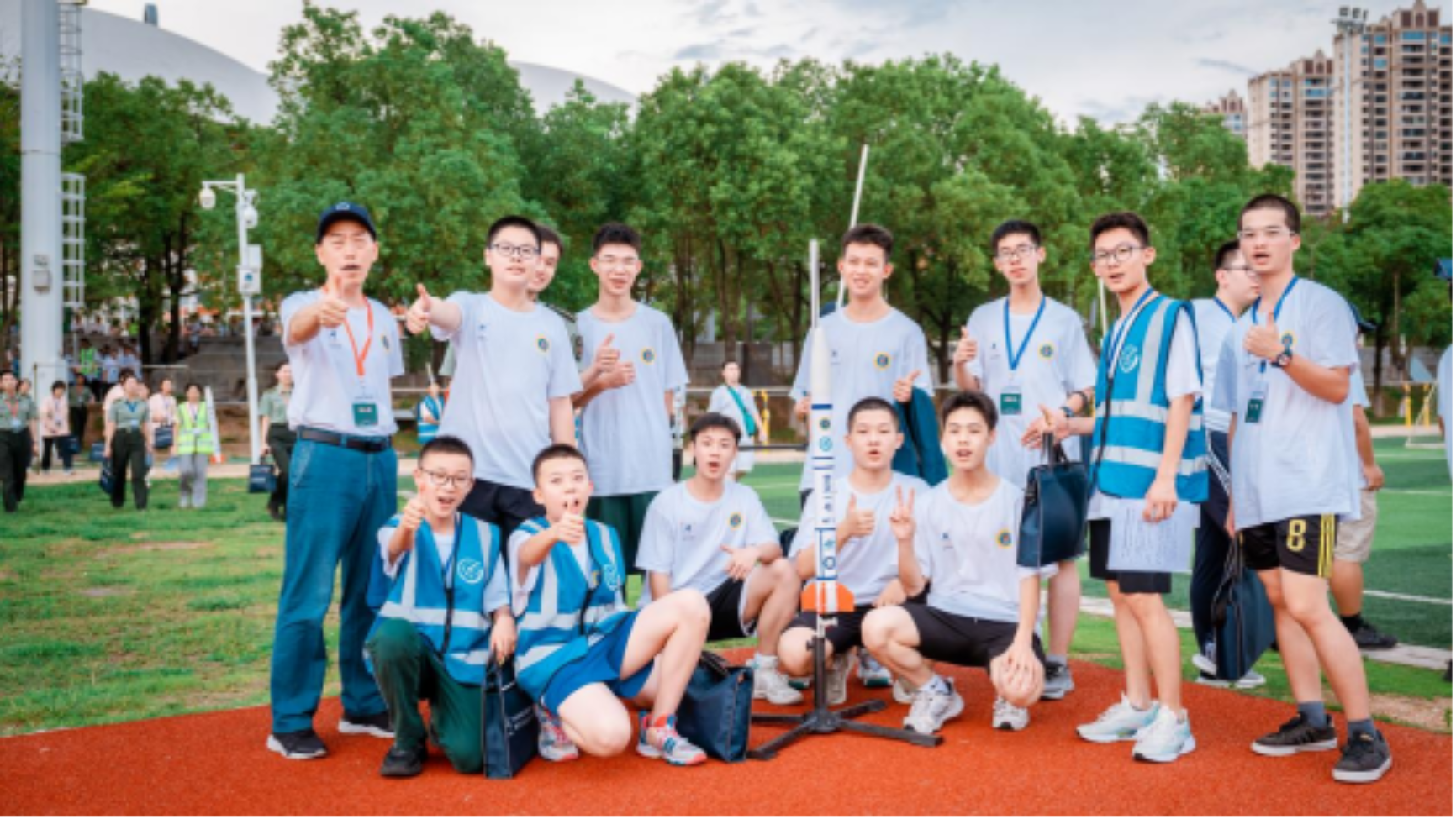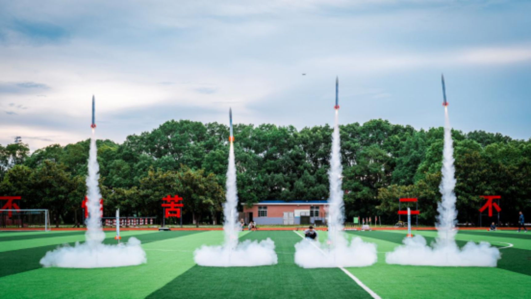 “五、四、三、二、一,点火!”经过紧张严谨的调试,“梦天一号”火箭在全体学员热切的目光中窜上天空,甩开田径场的欢呼与雀跃,拖着长长的尾焰直冲云霄。