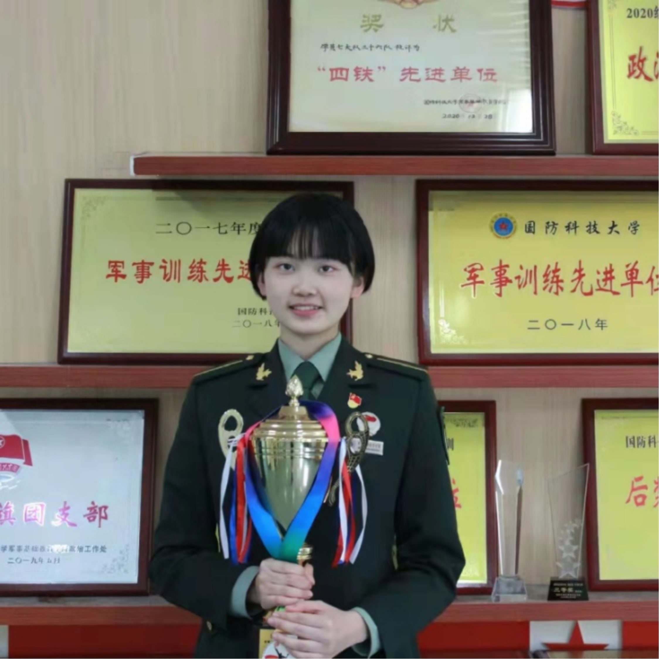 来自信息通信学院学员一大队二队的王芳是个爱笑的姑娘,也是个低调的“斜杠”青年。她虽然话不多,但是成绩却很响亮——体能“特三”级、三等功、“光华”奖学金、校运会冠军、训练标兵、学习标兵…都是她“斜杠”青年的“铁证”。在湖南师大附中带训,她是严格又亲切的女教官;在队里的团支部,她是认真踏实的书记;在火热的训练场,她是名副其实的“女兵王”;在红色的塑胶跑道,她是风一般的三千米冠军。