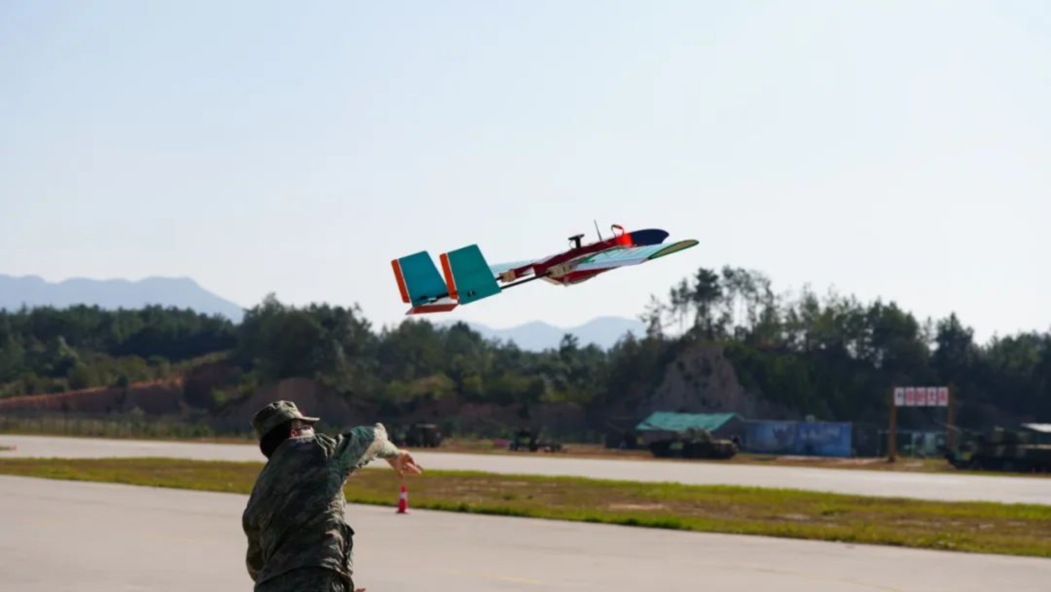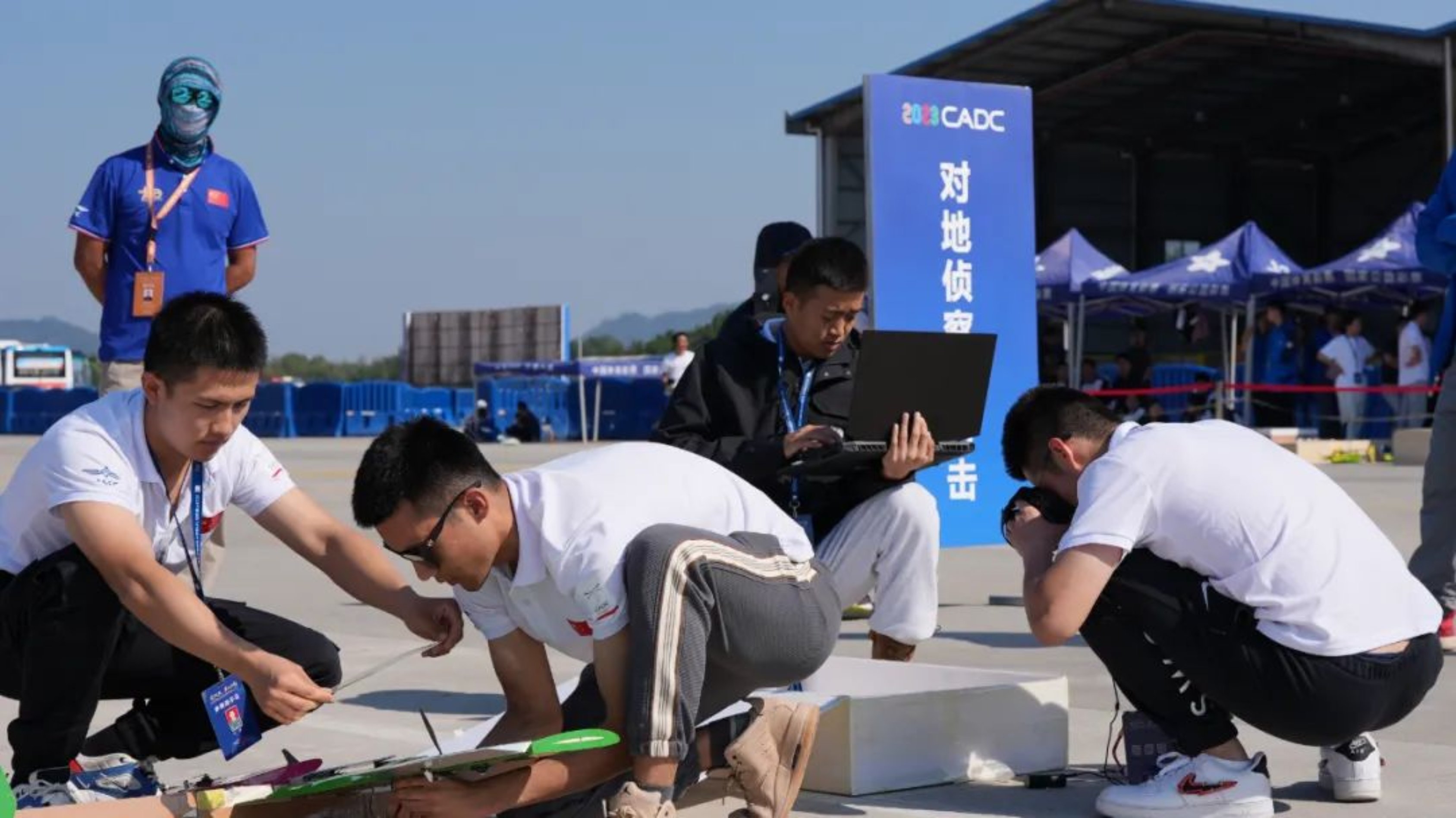 宽阔的机场跑道上,裁判员一声令下,学员李浩宇抛出飞机,轰鸣声中,一道航迹划破蓝天。