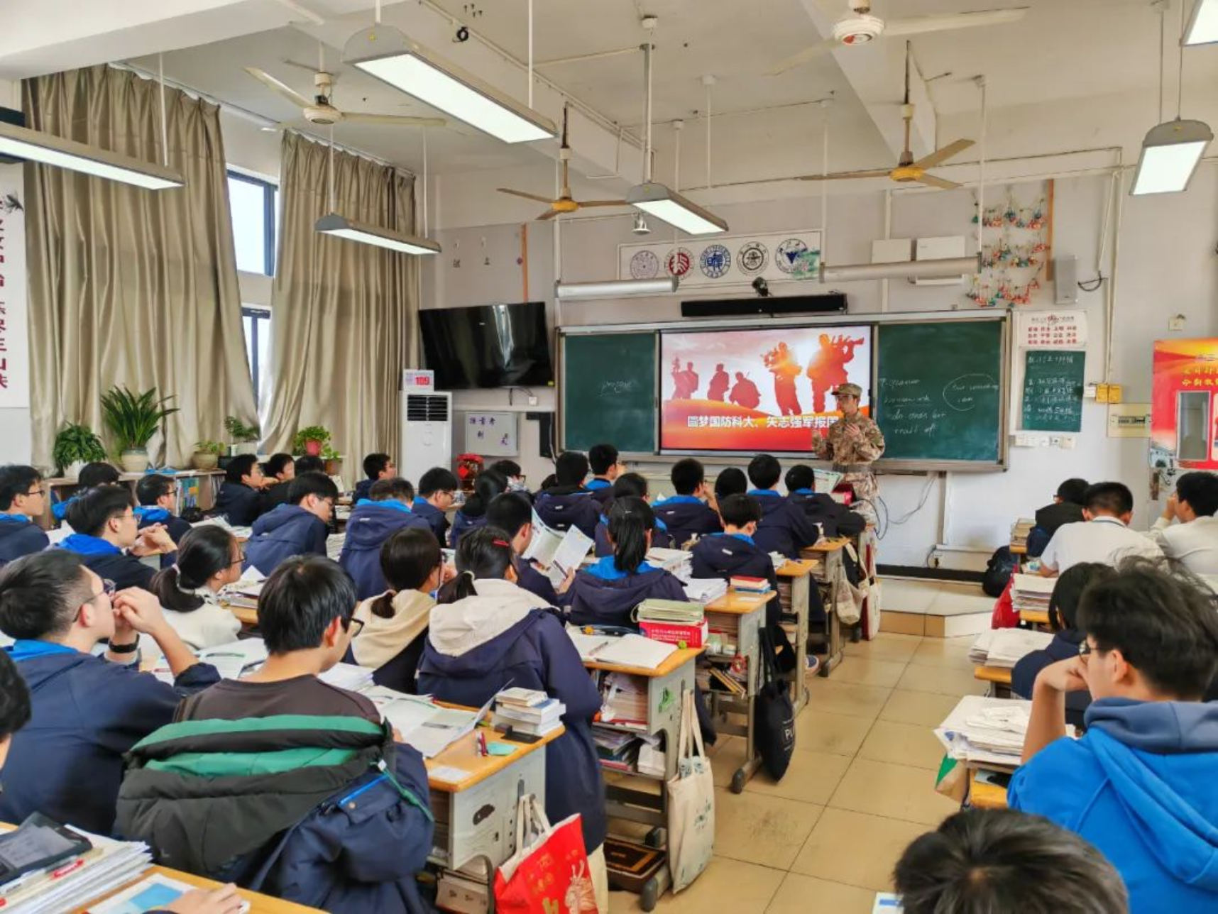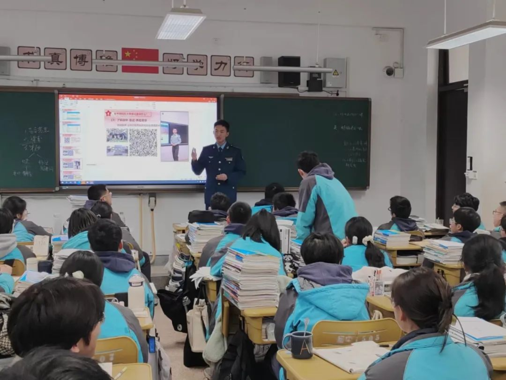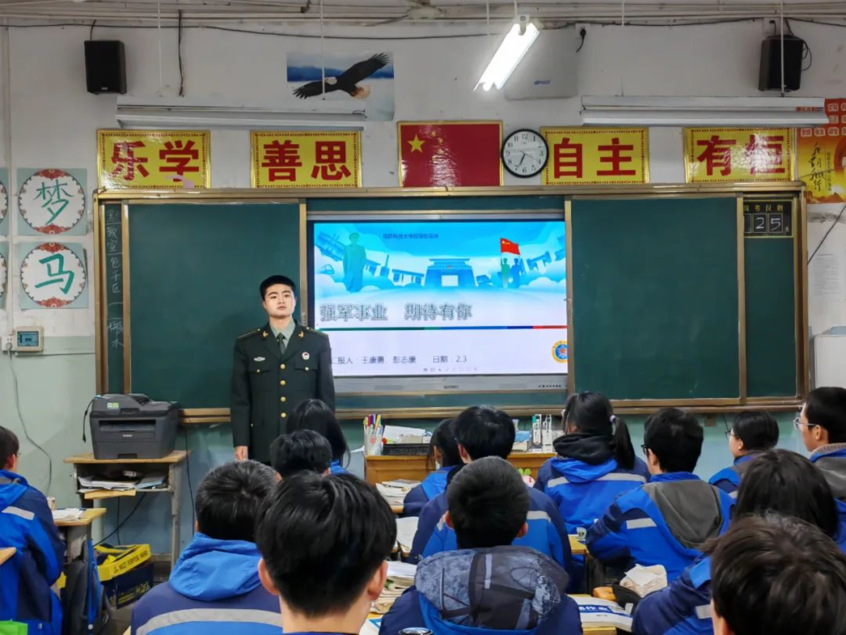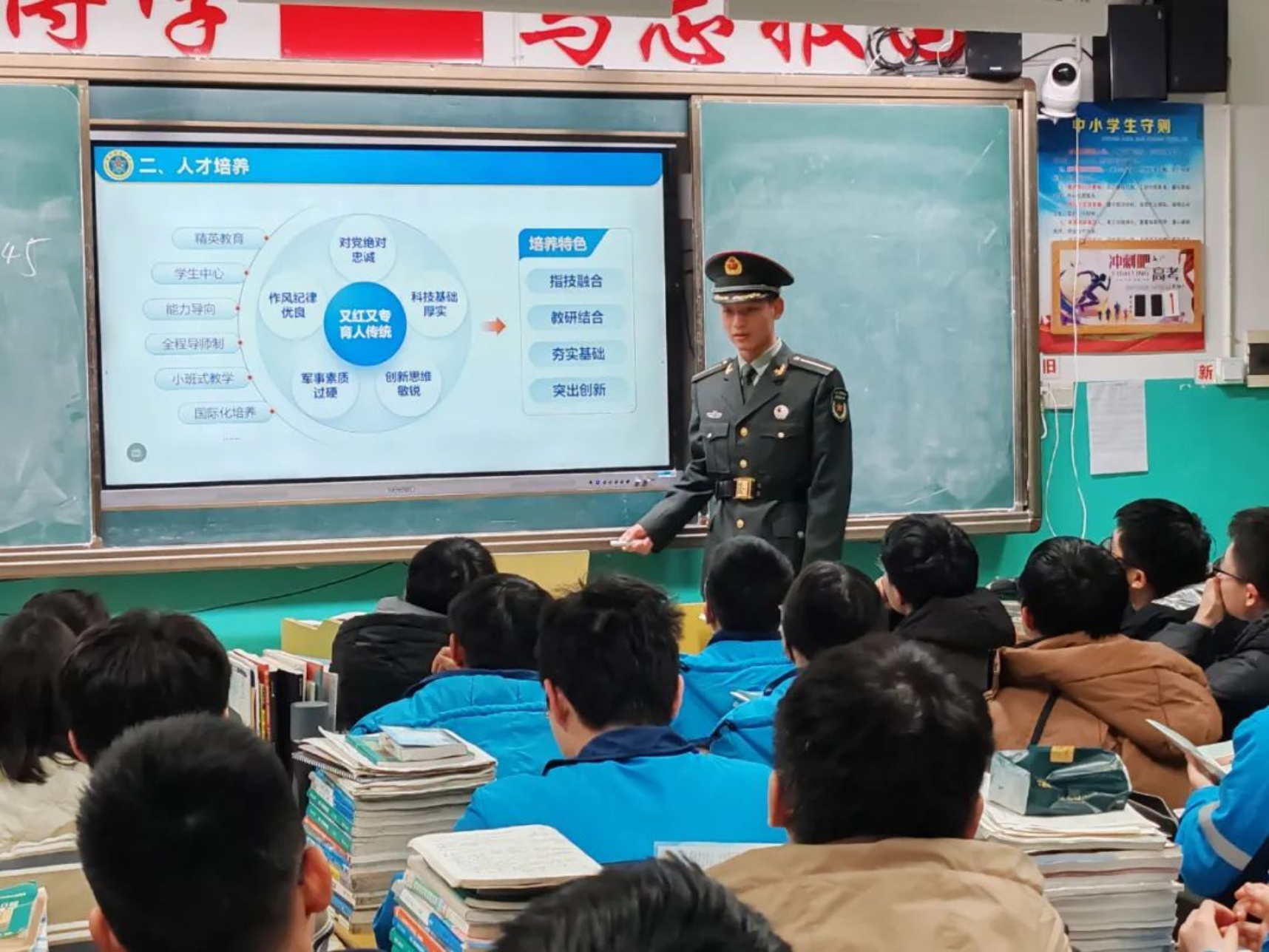 再回母校,身着军装的我心中倍感自豪,来到熟悉的高三教室,又见到了奋勇拼搏的学弟学妹们,我心中不由得为他们的努力奋斗而鼓舞。奋斗的青春最美丽,为国奋斗更光荣,希望通过这次宣讲将“奋斗不息,追求卓越”的浦中精神延续,更希望融入到“厚德博学,强军兴国”的伟大使命中去。