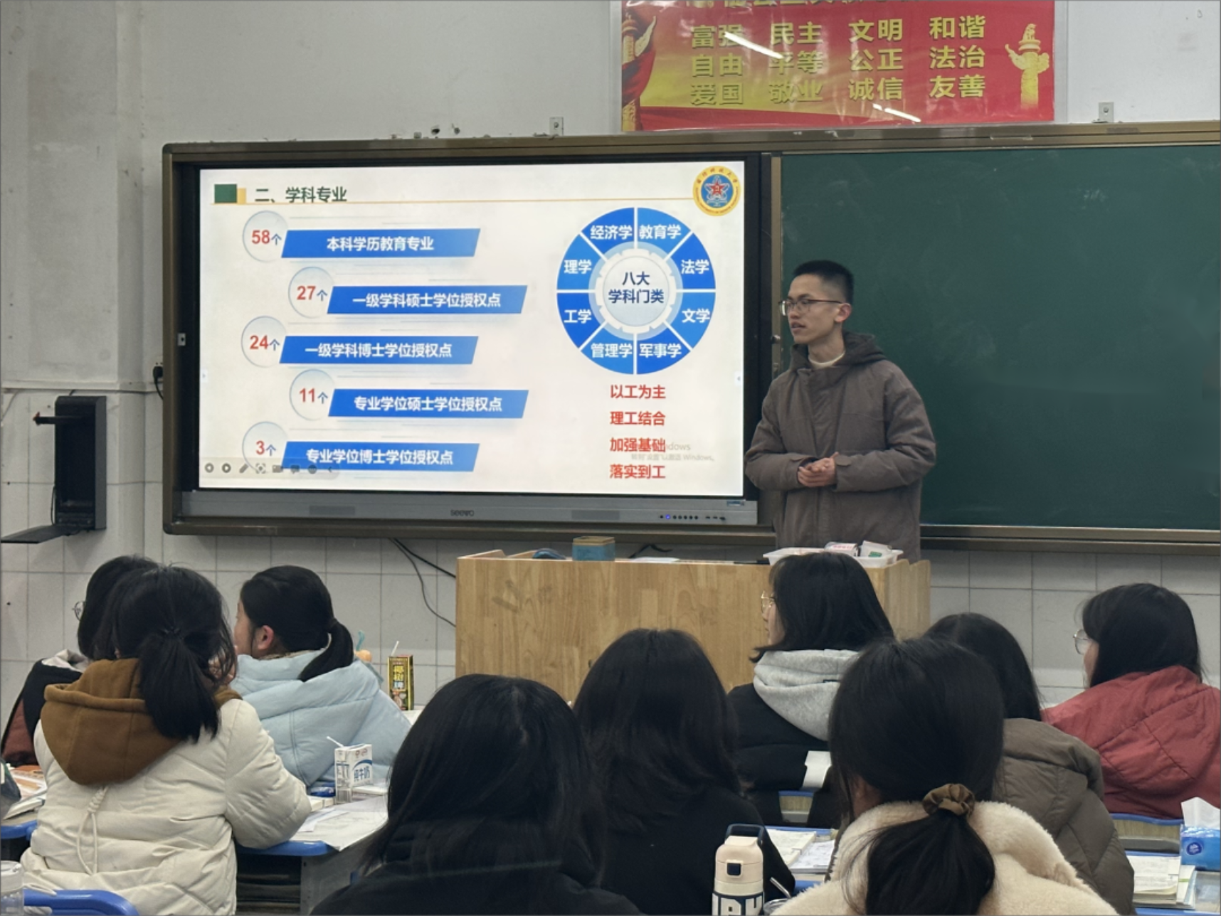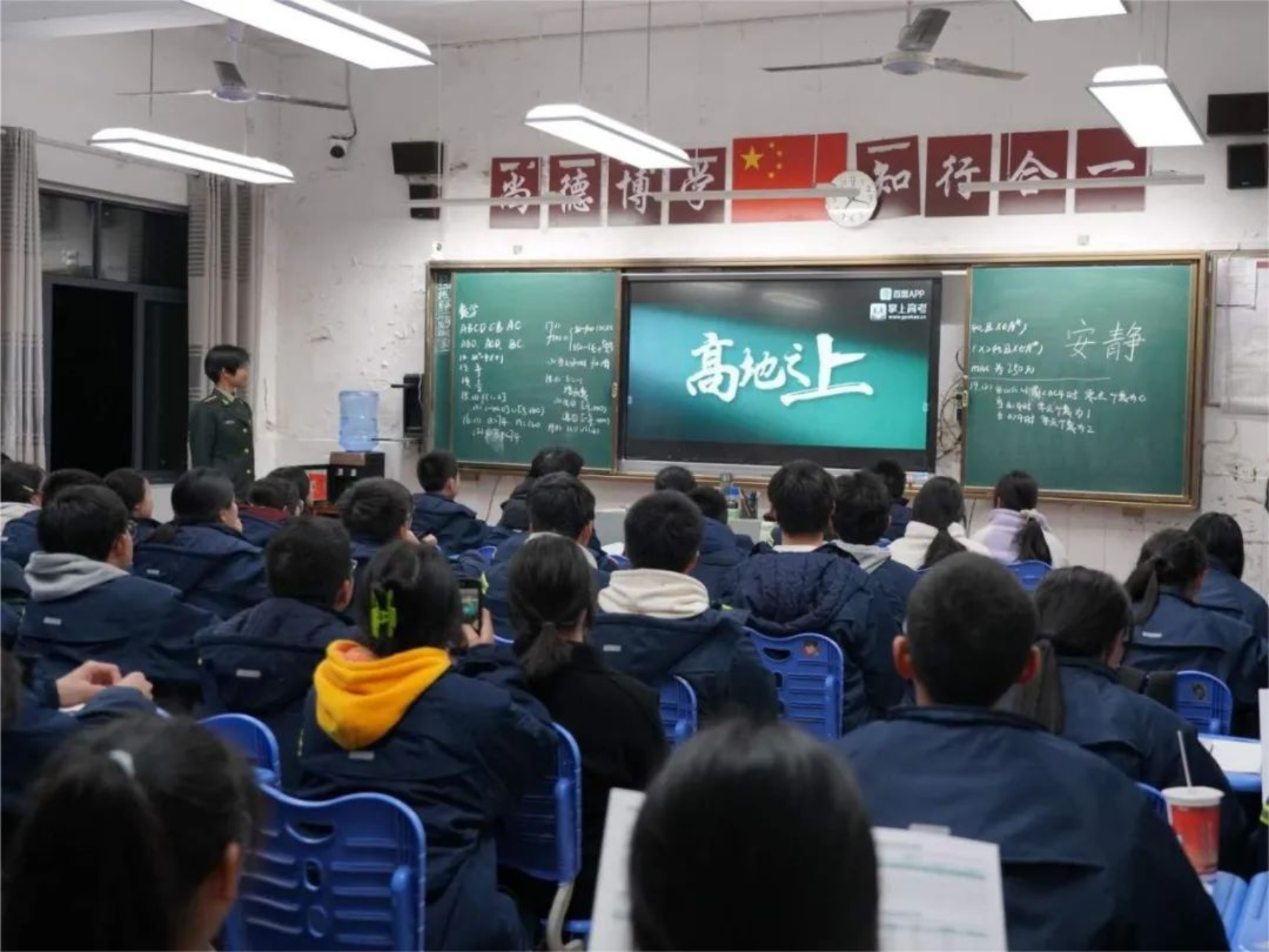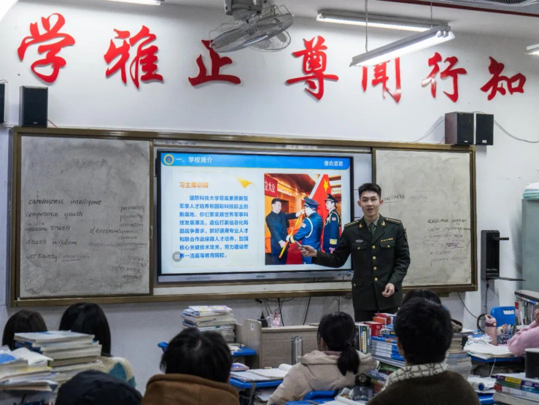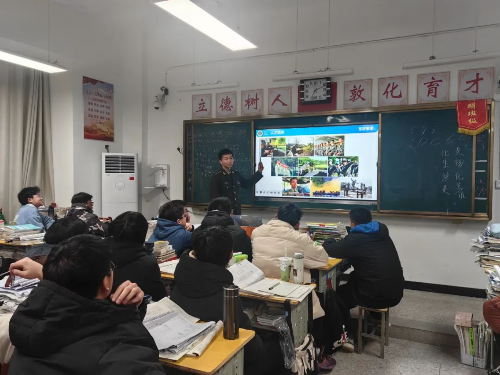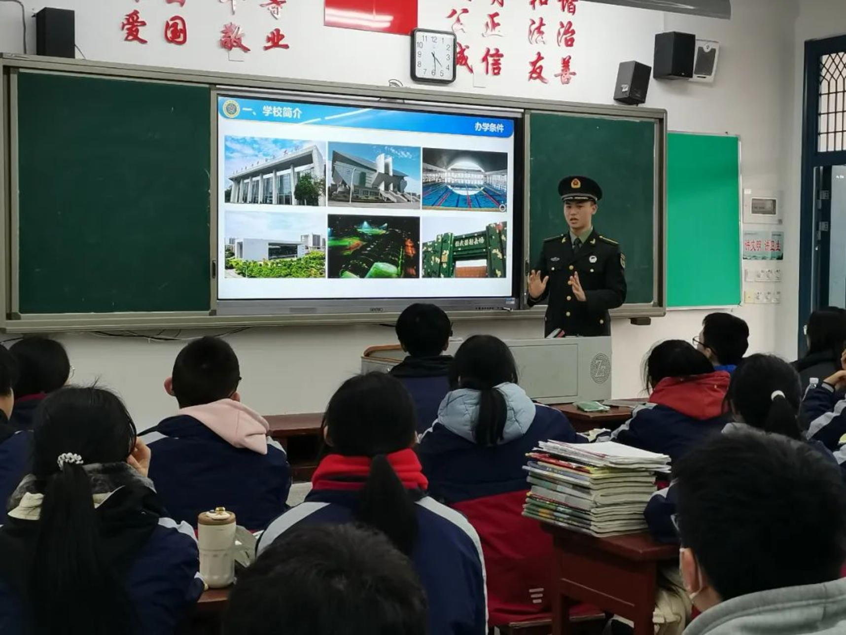 再回母校,身着军装的我心中倍感自豪,来到熟悉的高三教室,又见到了奋勇拼搏的学弟学妹们,我心中不由得为他们的努力奋斗而鼓舞。奋斗的青春最美丽,为国奋斗更光荣,希望通过这次宣讲将“奋斗不息,追求卓越”的浦中精神延续,更希望融入到“厚德博学,强军兴国”的伟大使命中去。