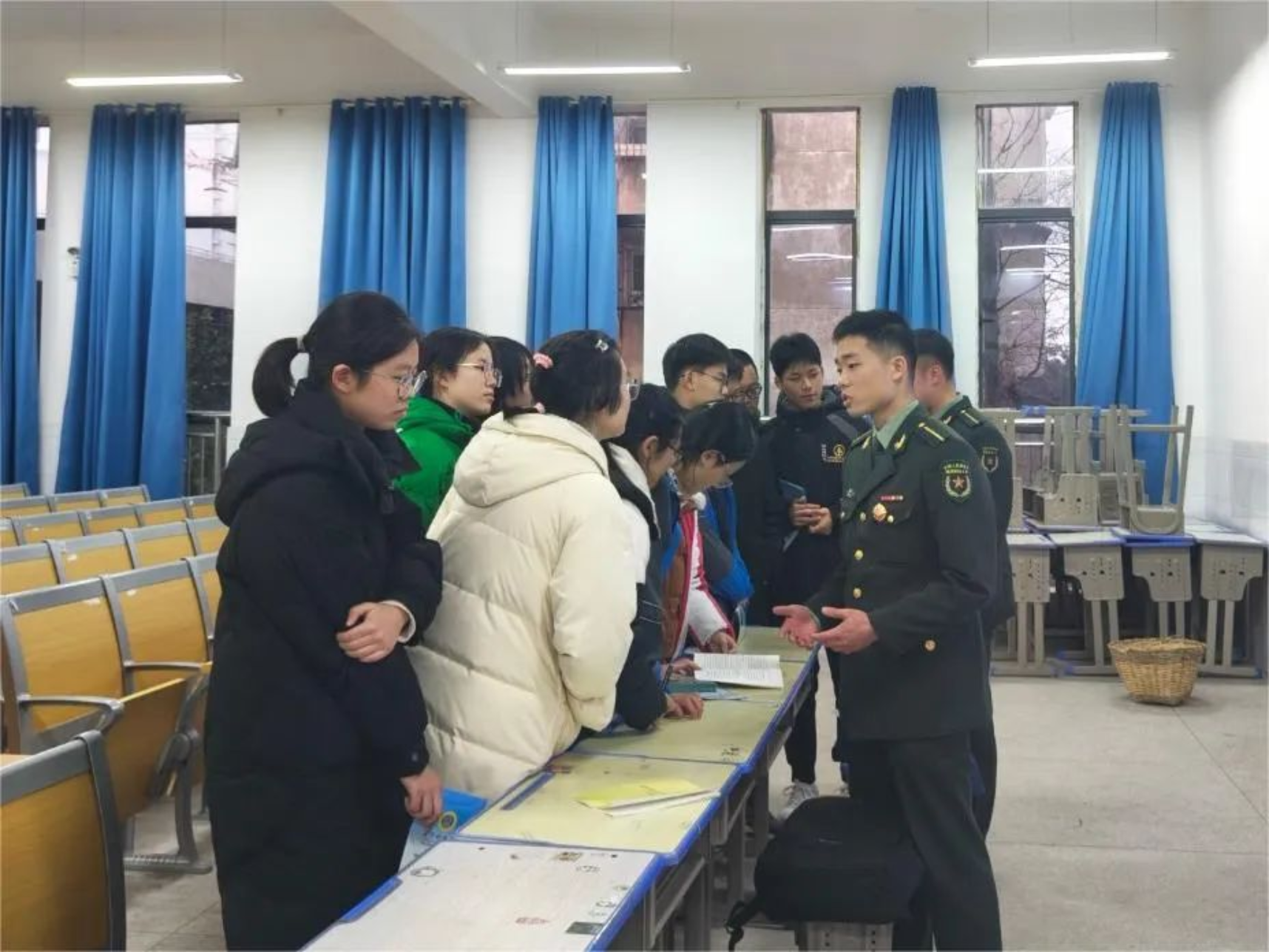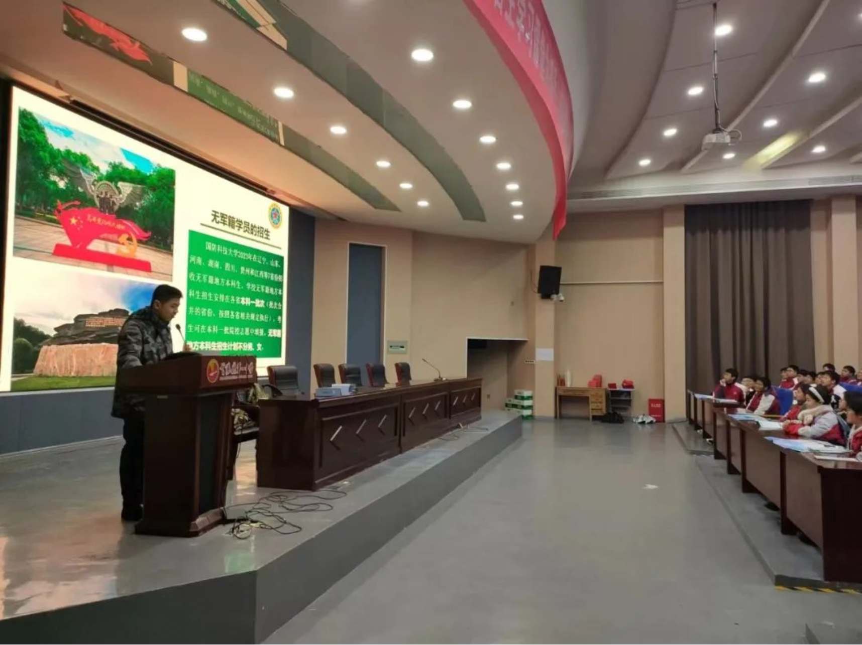 为让更多的萍乡中学学子了解国防科大,激发大家献身国防事业的热情,毕业于萍乡中学的汇报宣讲团成员利用寒假走进母校,秉持“为学弟学妹答疑解惑,展现国防科大学员良好精神风貌”的原则,结合自身经历激发学弟学妹从军报国的热情,向学弟学妹讲解国防科大“应战而生,为军而盛”的光辉历史和强大的教学科研实力。汇报宣讲团成员还为有意向报考国防科大、立志从军报国的同学们发放学校主题文创物品,鼓励他们将理想化作学习的动力,以积极向上的精神面貌投入到学习生活中去。