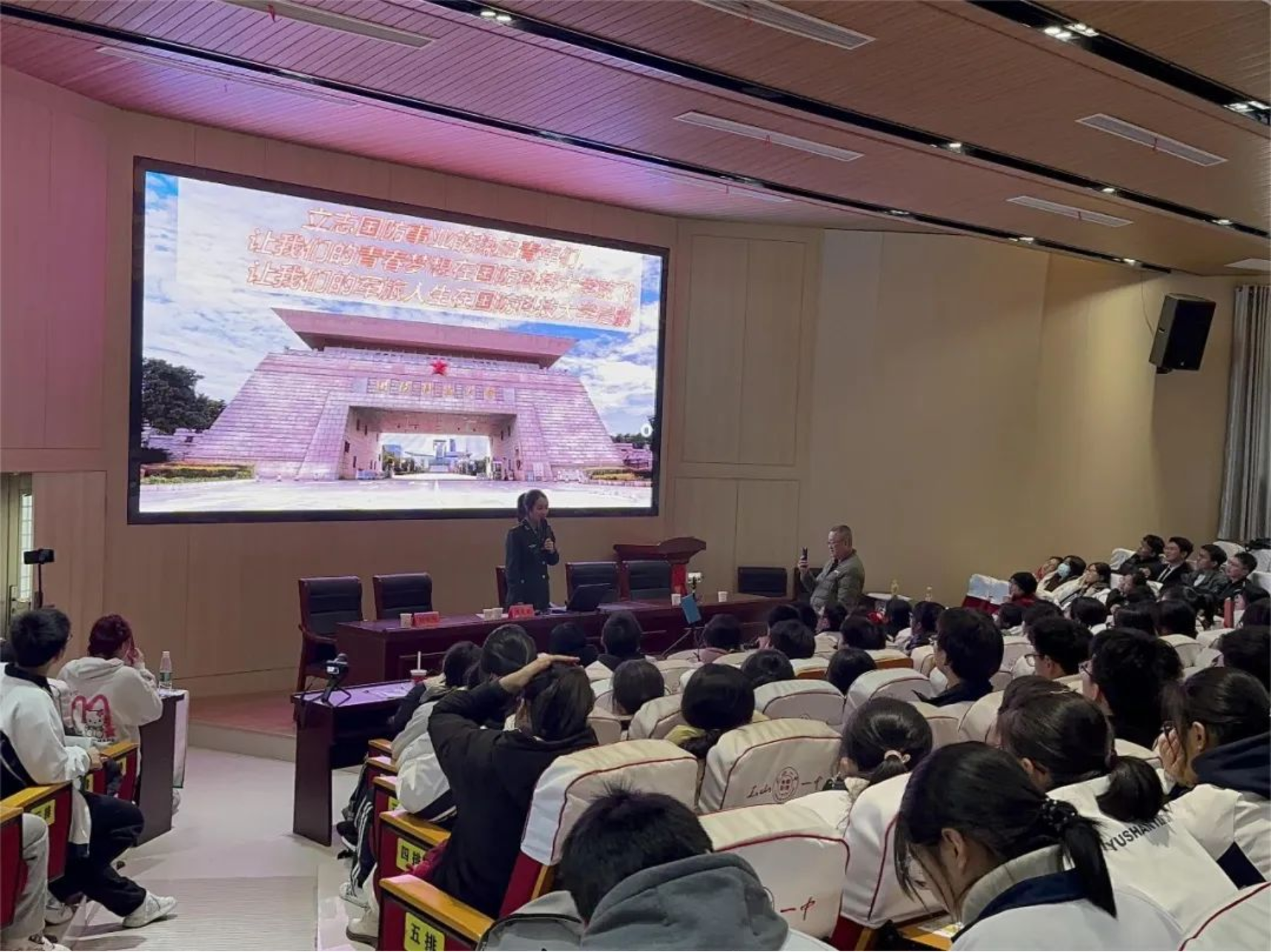 我怀着无比激动地心情,重返了母校。熟悉的校园,熟悉的校服,高中奋斗的时光仿佛就在昨日。从校服到军装,从高中的懵懂幼稚逐渐走向成熟,半年近170天,我逐渐完成两个转变,成为了一名光荣的科大学员。宣讲过程中,我深情地向学弟学妹们介绍国防科大的独特魅力。他们的眼中闪烁着对科大的好奇与向往,让我仿佛看到了当初自己的影子。我热情分享自己在科大的学习和生活经历,半年的科大生活让我收获颇丰,我也十分希望附中的学弟学妹们能报考科大,携笔从戎,共同书写属于我们的青春华章。