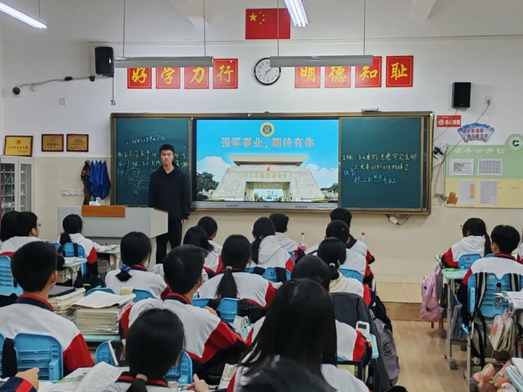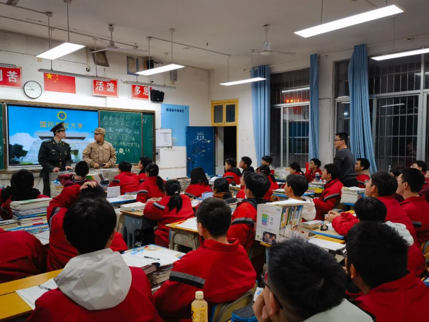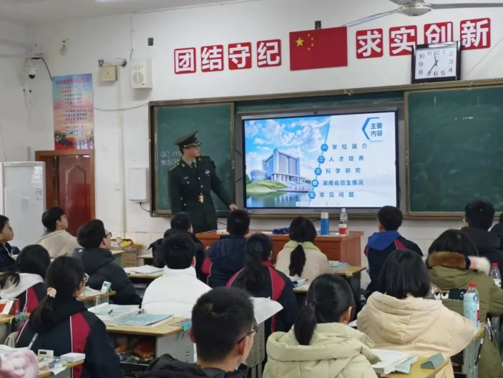 1月31日,学校生长军官本科学员苏伟航一行来到宁乡市实验中学励志部开展了一场精彩纷呈的宣讲活动,宣讲覆盖实验中学重点班。宣讲团首先从国防科大的建校历史、办学理念和发展现状等方面进行了详细介绍,重点解读在湖南省的招生政策,使同学们对科大有了更加全面深入的了解,为有意报考的同学们提供了指导。宣讲结束后,同学们就高考报名中存在的困惑与宣讲团进行了面对面交流,宣讲团耐心解答,并鼓励同学们潜心学习的同时提高身体素质。