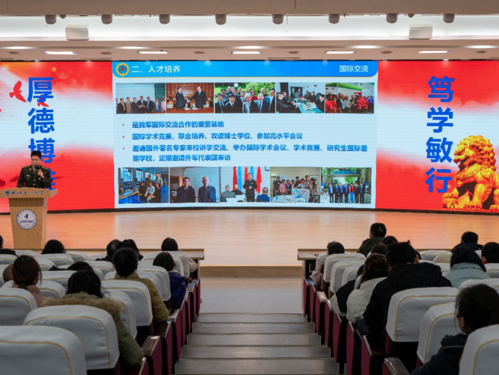 寒假之初,“走心人才队”汇报宣讲团立即动身,带着满腔激情和热血回到襄阳五中,为高三学子百日冲刺加油打气,鼓励高三学子确定报考目标,为强军兴军事业贡献力量。宣讲现场,宣讲团成员严肃而不失活泼的描述引起学弟学妹们对国防科大的兴趣。本次宣讲让襄阳五中学子们了解到更真实立体的军校生活,从军报国的种子在他们的心中生根发芽。