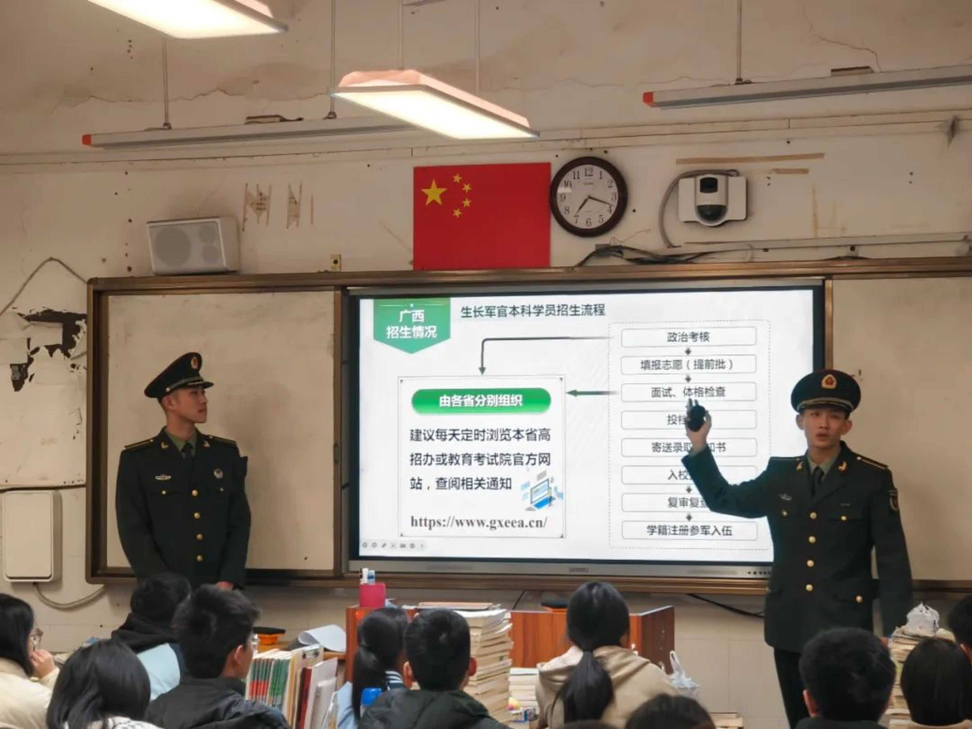 近期,8名生长军官本科学员回到母校南宁市第二中学开展招生宣讲。在广西招生组李金才老师的直接指导下,宣讲团与高中母校提前联系,确定任务分工,对宣讲事宜进行了充分准备。