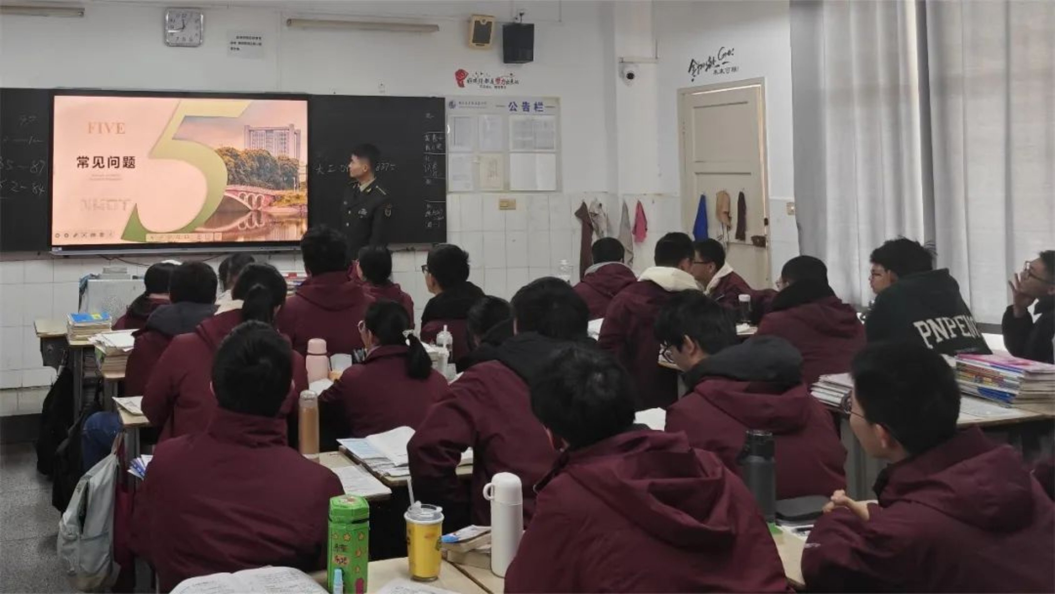 1月19日,毕业于孝感高中的科大学子明泽文回到母校,在湖北招生组丰志伟老师的指导下,以进班报告的形式开展“母校中学行”宣讲活动。在宣讲现场,明泽文结合自身的成长经历,具体生动地讲解了国防科大的光辉历史、办学特色以及在湖北省的具体招生政策等内容。同学们热情似火,积极踊跃地提问有关科大学习训练和校园生活等方面的问题,明泽文依次耐心详细地进行了解答。整场活动组织有序,极大激发了同学们对国防科大的向往。