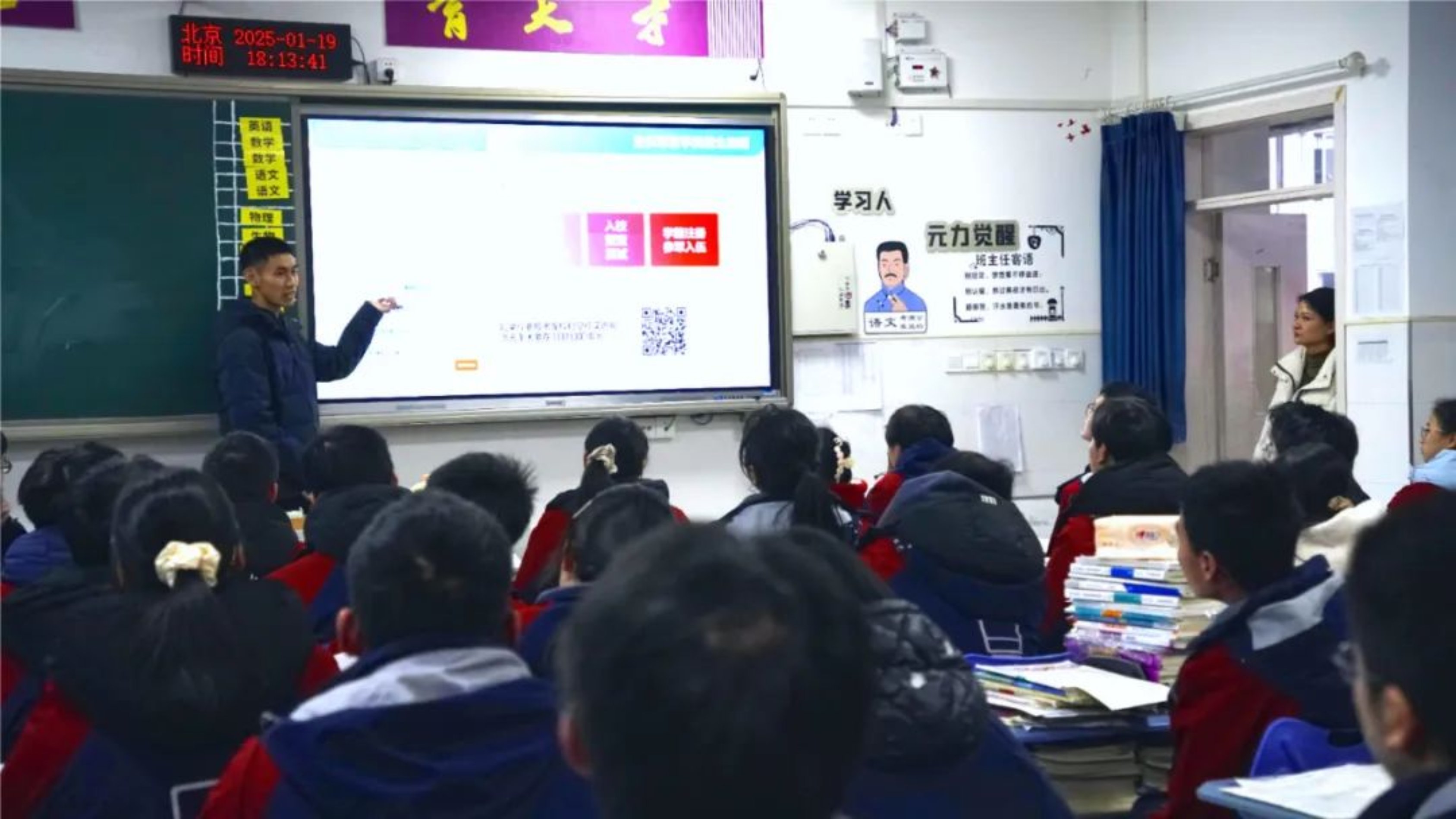 1月20日,毕业于重庆市渝北中学的科大学子钟文韬返回母校中学开展了招生宣传活动。在渝北中学高三年级的教室里,钟文韬结合自己在Beat365唯一官方网站的学习和成长经历,详细介绍了科大的办学特色及军校生活,鼓励同学们努力学习,积极投身国防事业。在互动环节中,钟文韬耐心解答了同学们对科大的军事课程、体能训练和日常生活的问题,并分享了自己在备考过程中的经验和心得,同时向同学们赠送了学校主题文创产品,现场气氛热烈。