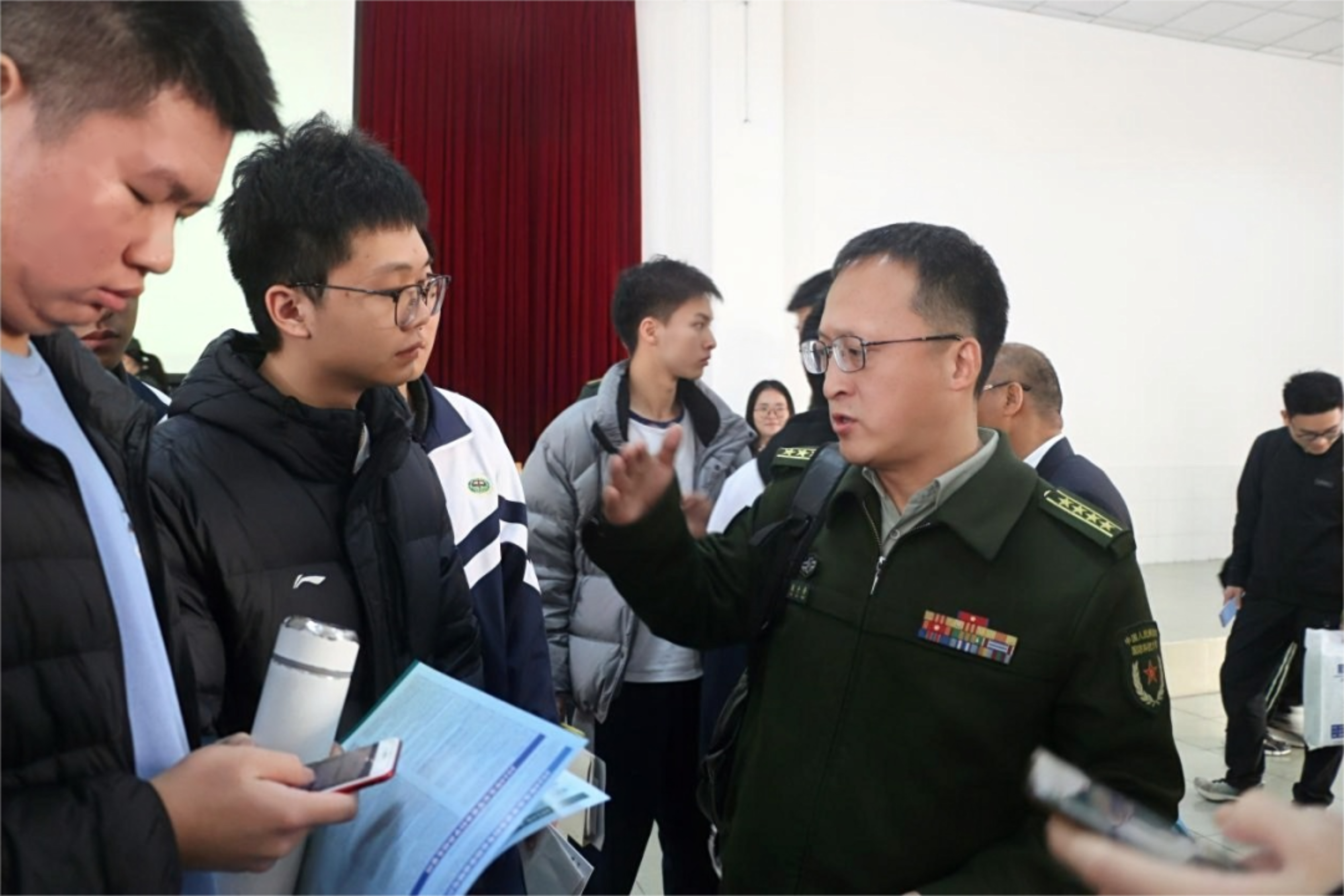互动交流环节,同学、家长对军检要求、政治考核、志愿填报等相关内容进行踊跃提问,宣讲团成员逐一解答,并鼓励大家在高考冲刺阶段稳住心态,争取考出好成绩。与此同时,龚昊等人在体育馆以现场答问、分发文创的方式帮助高中学子们进一步了解科大。