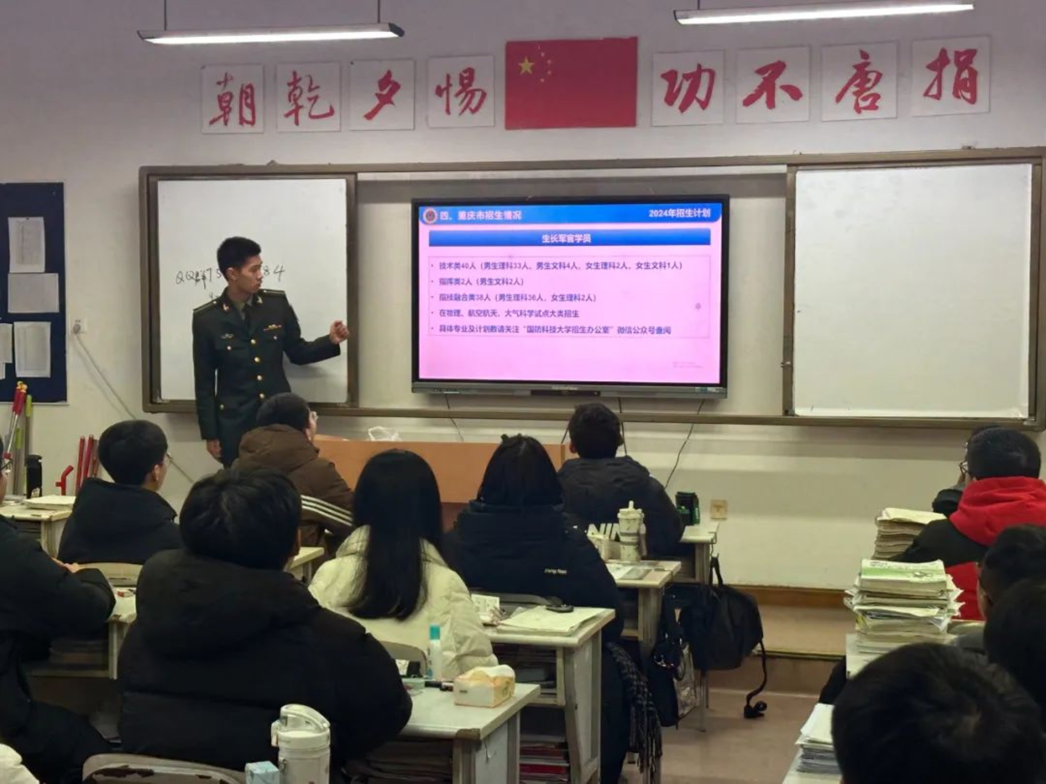 近日,3名生长军官本科学员返回重庆市巴川国际高级中学校开展招生宣讲活动。宣讲团从科大的历史沿革、学校特色引入,着重介绍了人才培养、科研实力等情况,并结合自身成长经历,从学习、训练、生活各方面引领有志投身国防事业的学子深入了解学校,把握最新招生动态。期间,宣讲团成员为学弟学妹逐一解惑答疑,一对一引导同学们通过考生服务系统填报个人信息,以便获得更优质的报考服务。