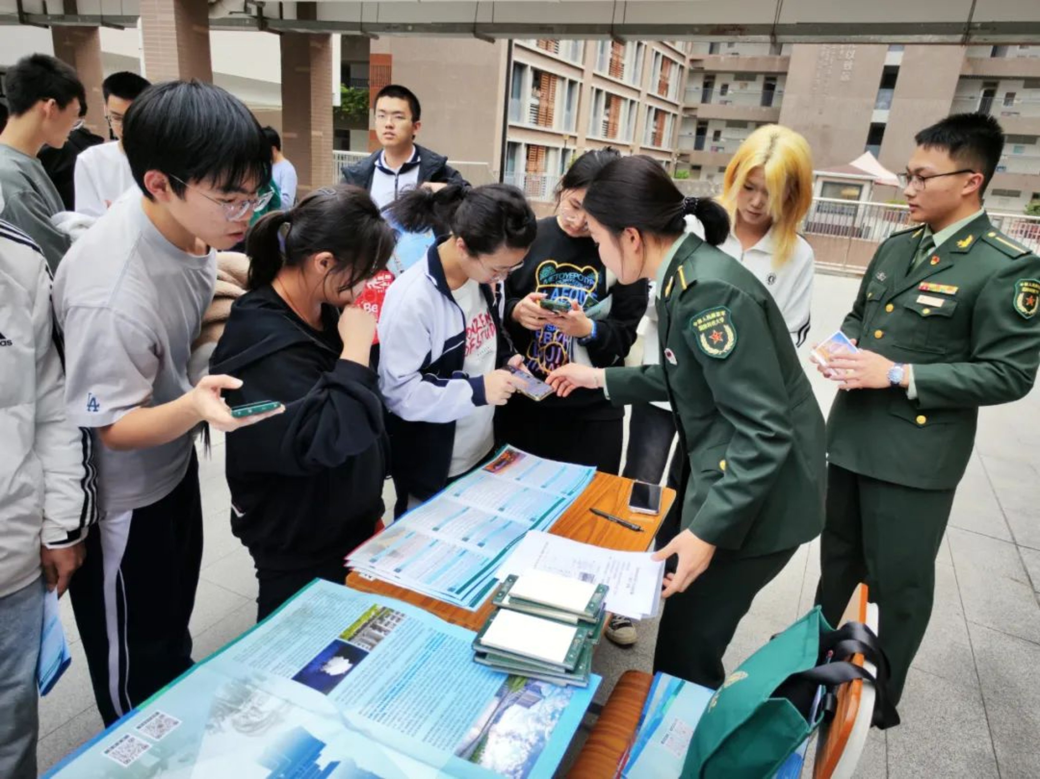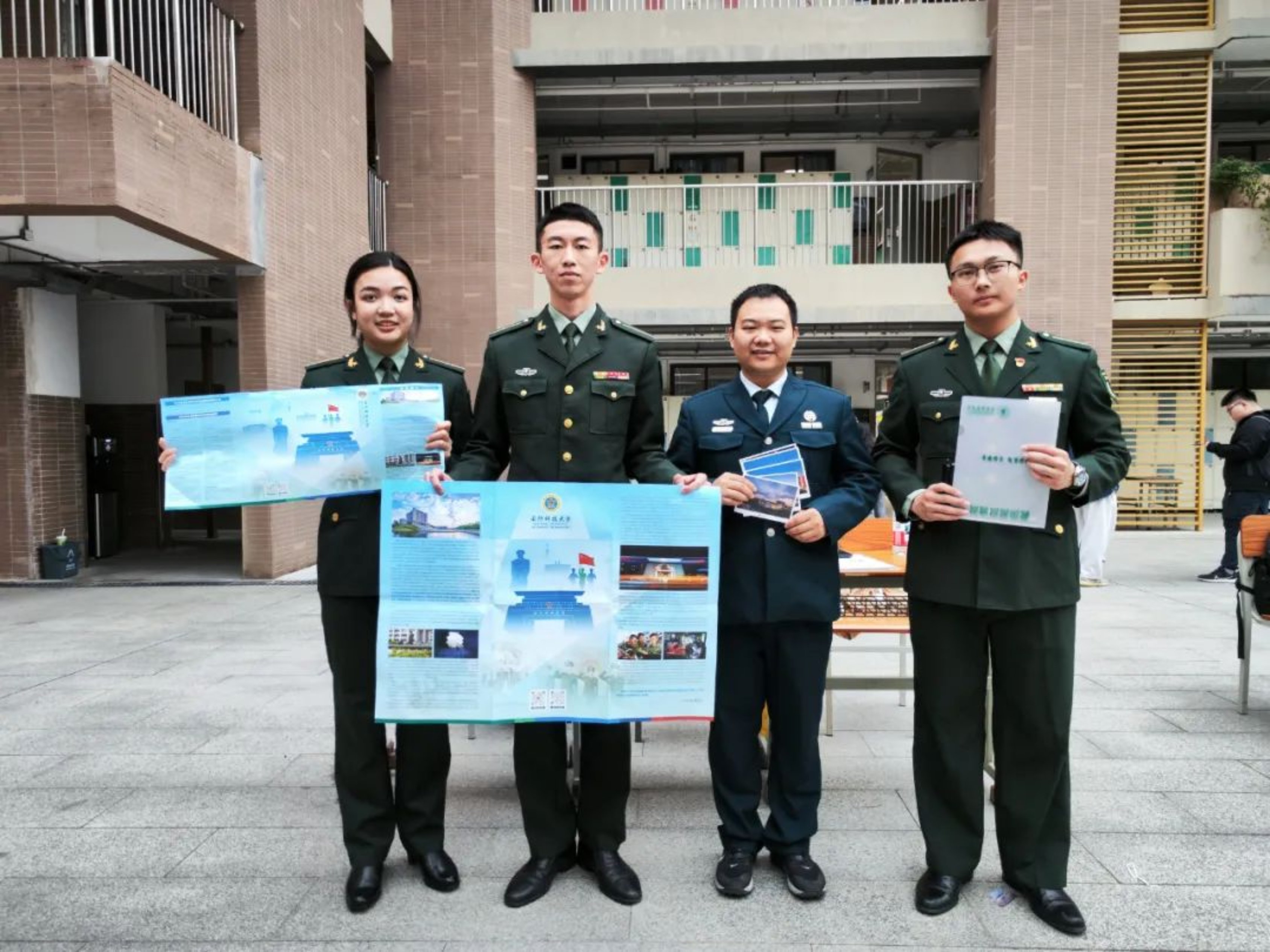 近期,由3名生长军官本科学员组成的汇报宣讲团回到母校深圳中学开展招生宣讲活动。在广东招生组廖麒翔老师全程指导参与下,宣讲团以设点宣讲答疑的形式,为有志报考军校的学子们介绍科大基本情况和“高地”特色文化,解答学子们关注的关于报考流程、体检标准、毕业去向等问题,还向同学们分发了学校特色文创产品,鼓励大家积极投身国防事业。
