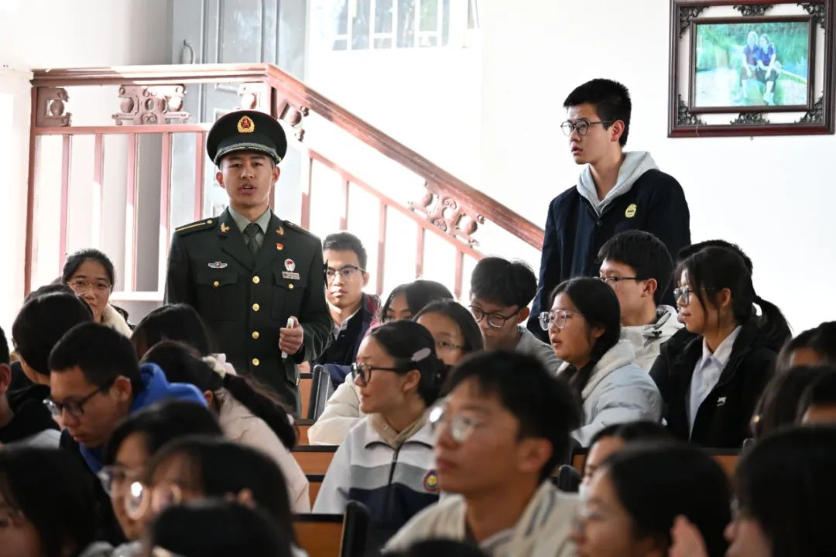 随后,蔡沂豆同学开展了一场经验分享会,根据自己的高考经历,向同学们传授了备考策略和心态调整方法。同时,他结合一学期的军校成长经历,从学习、训练、课余生活等方面,向同学们讲述了自己在军事训练和学术活动中的成长与收获。分享会结束后,同学们反响热烈,现场掌声雷动。此次宣讲活动在不少同学心中种下了国防梦的种子,进一步坚定了他们从军报国的决心与信心。