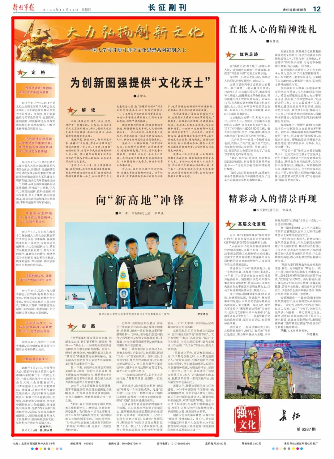 “那年,我们学院有两个团队的代表在现场聆听习主席讲话,倍感荣幸、深受鼓舞。我们始终牢记习主席嘱托,持之以恒抓好尖端科技攻关,坚持用创新文化推进强军实践。”该院领导说:“如何让师生在创新文化熏陶下汲取向‘新高地’冲锋的力量,是我们一直在思考的问题。”
