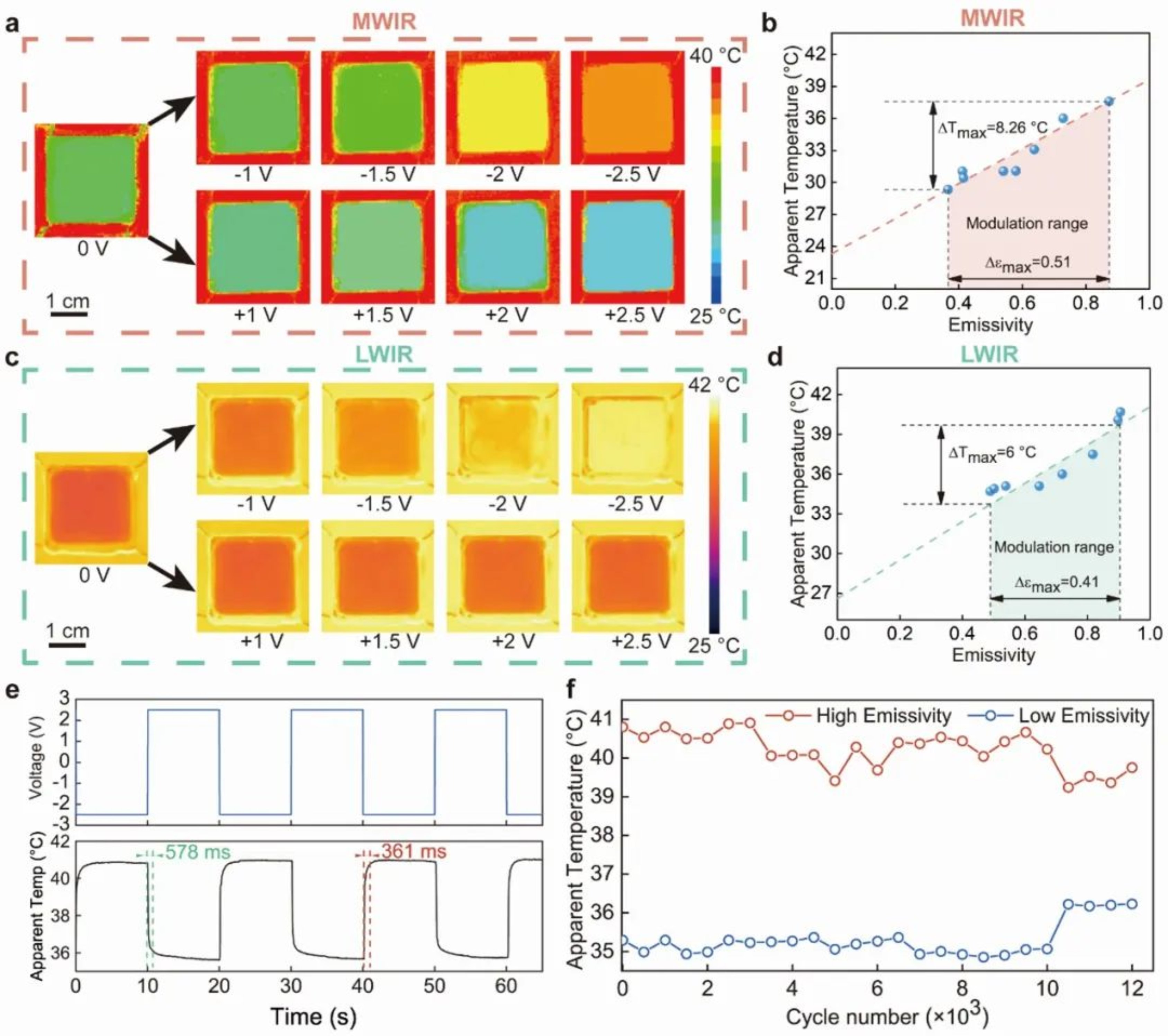 研究表明,该器件在3-5 μm和7.5-13 μm红外窗口波段的红外发射率动态调控量可达0.51和0.41,且发射率变化前后器件均保持84.7%的高可见光透过率。此外,该器件还具有响应时间快(< 600 ms)、循环寿命长(>10000次)的特点。这种透明电致变红外发射率器件为智能热控、多光谱信息显示和智能伪装等领域带来了新的机遇。