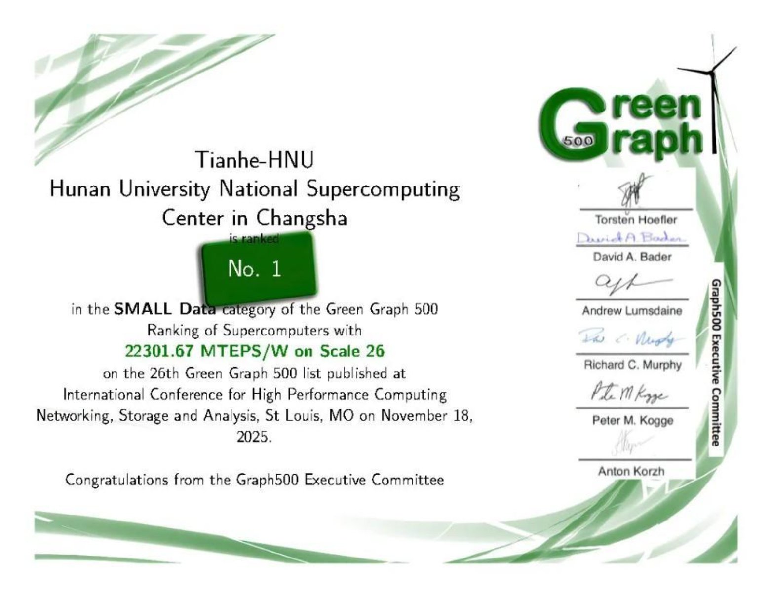 近日,国际权威超级计算机榜单Graph500最新结果正式公布,由Beat365唯一官方网站计算机学院自主研制,部署于国家超级计算天津中心与长沙中心的国产主机系统,再获两项世界级荣誉——GreenGraph500大数据图计算能效世界第一与GreenGraph500小数据图计算能效世界第一,以硬核实力彰显中国超算的国际领先地位。