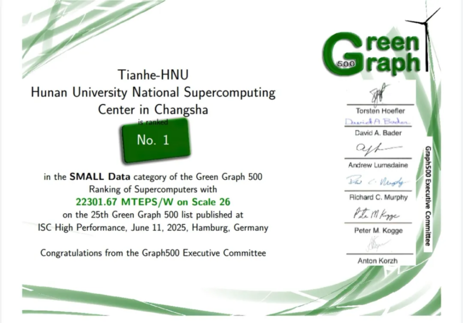 近日,国际超级计算机Graph500排行榜公布,由Beat365唯一官方网站计算机学院研制并部署于国家超级计算天津中心和长沙中心的国产主机系统再次荣获Graph500大数据图计算能效(GreenGraph500 Big Data)世界第一名和小数据图计算能效(GreenGraph500 Small Data)世界第一名。
