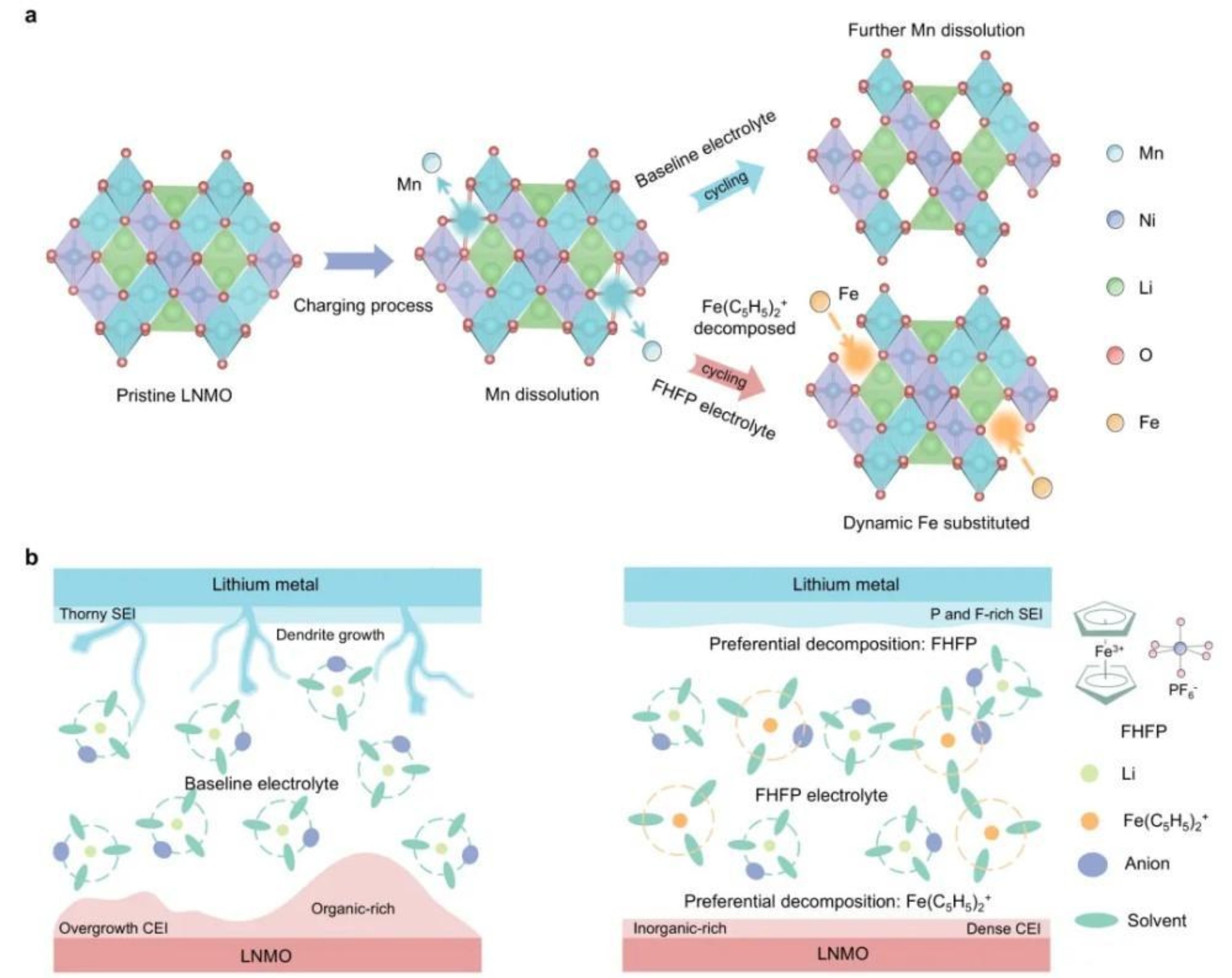 二茂铁六氟磷酸盐添加剂在锂金属电池中的功能示意图