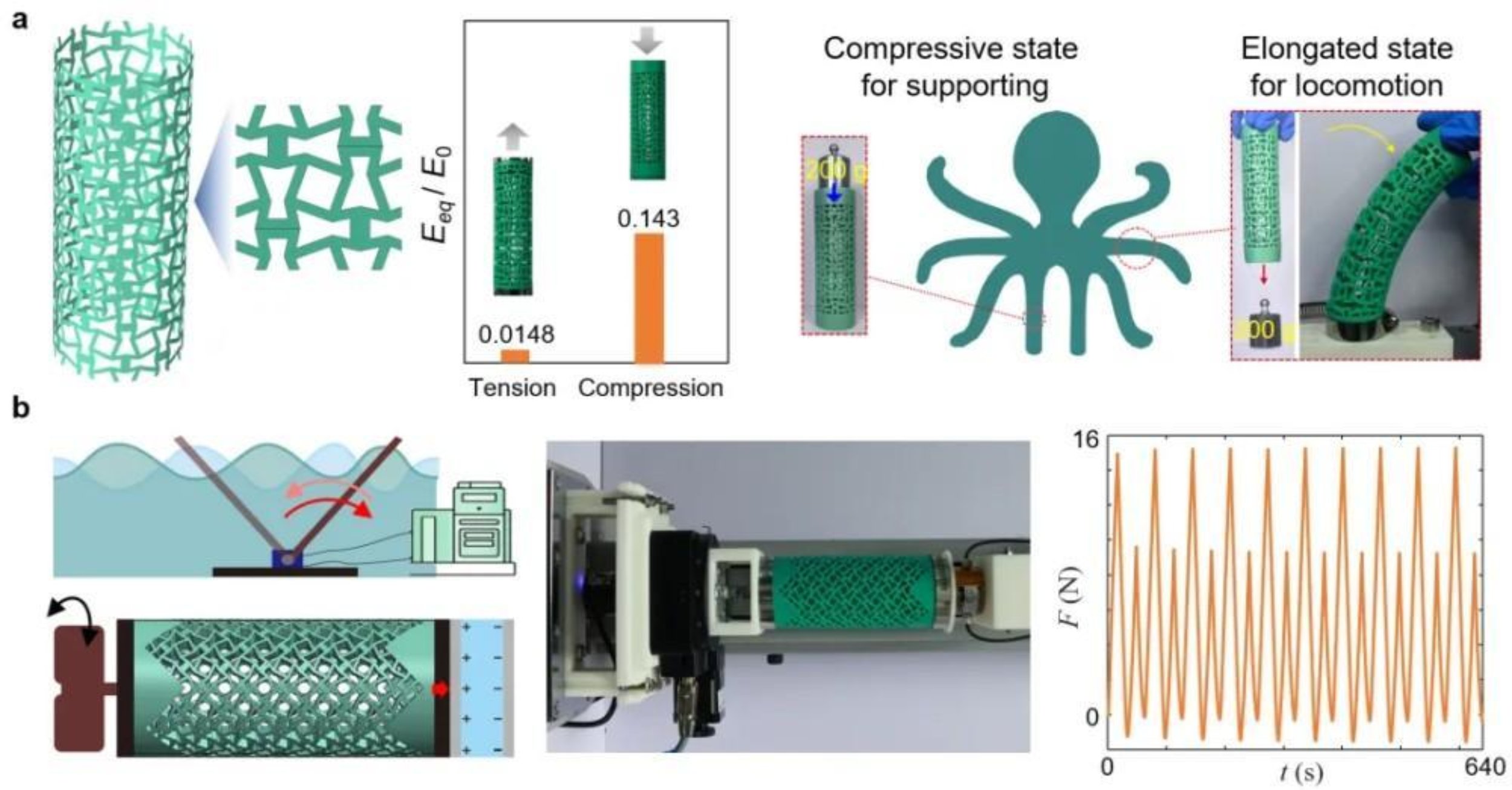 图2 非互易机械超结构的潜在应用。a,超结构曲面映射与面向外骨骼的高承载性;b,正反转均可产生压力的波动-压电能量高效转化