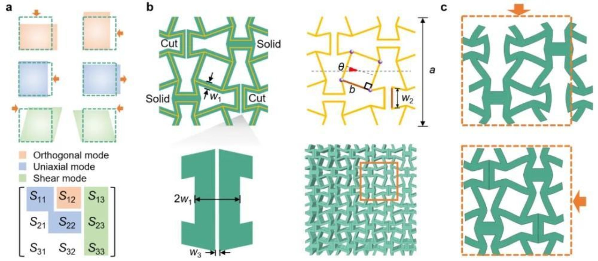 图1 多模式-可编程的静态非互易机械超结构。a,不同非互易行为的本构张量理论框架;b,融合预定义接触的超结构拓扑设计。