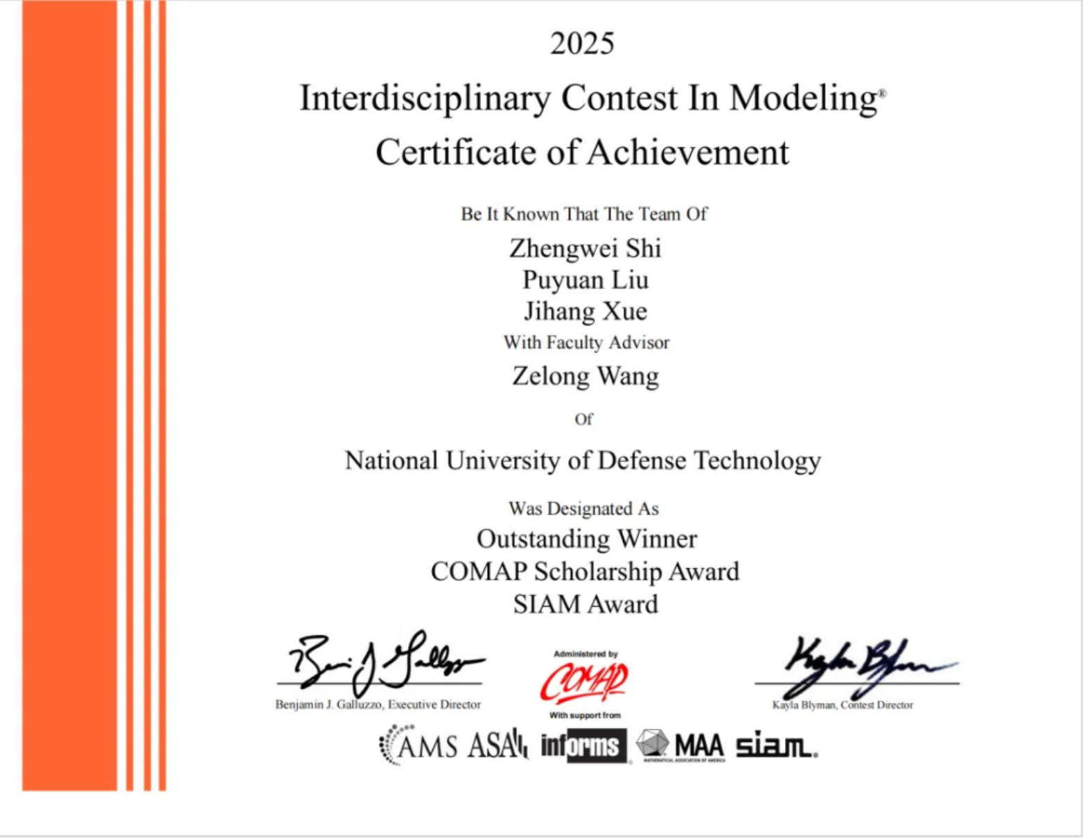 来自系统工程学院本科学员石正玮、刘濮源和电子对抗学院本科学员薛霁航组成的团队,在理学院王泽龙教员的指导下斩获特等奖和美国工业与应用数学学会(SIAM)冠名奖;来自军政基础教育学院本科学员彭城、吴瀚森和理学院钱学森拓展班本科学员罗泽宇组成的团队,在理学院陆军教员的指导下,斩获特等奖和美国统计学会(ASA)冠名奖,这是我校首获该学会的冠名奖。同时,我校学员还在该项赛事中获得8项特等奖提名奖、21项一等奖,获奖成绩位列全球参赛高校前列。