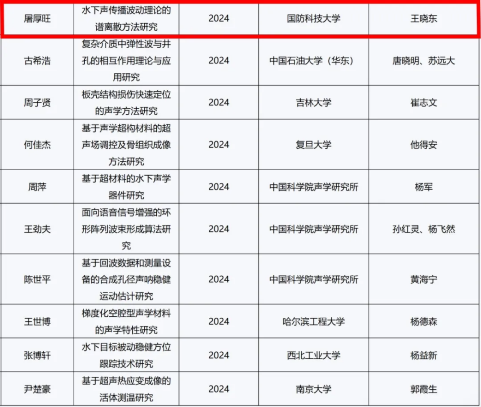 “中国声学学会博士学位论文激励计划”是中国声学学会自2019年设立的激励奖项,旨在提高我国声学领域博士研究生教育质量,促进高层次创新性人才培养工作,鼓励创新性研究,推动中国声学领域的进步。本次评选范围包括2021-2024年度博士学位论文,涉及学科包括物理声学、建筑声学、水声学、空气声学、医疗超声学、生物声学、环境声学、非线性声学、音乐与心理声学等分支学科,每年度遴选不超过10篇论文入选。