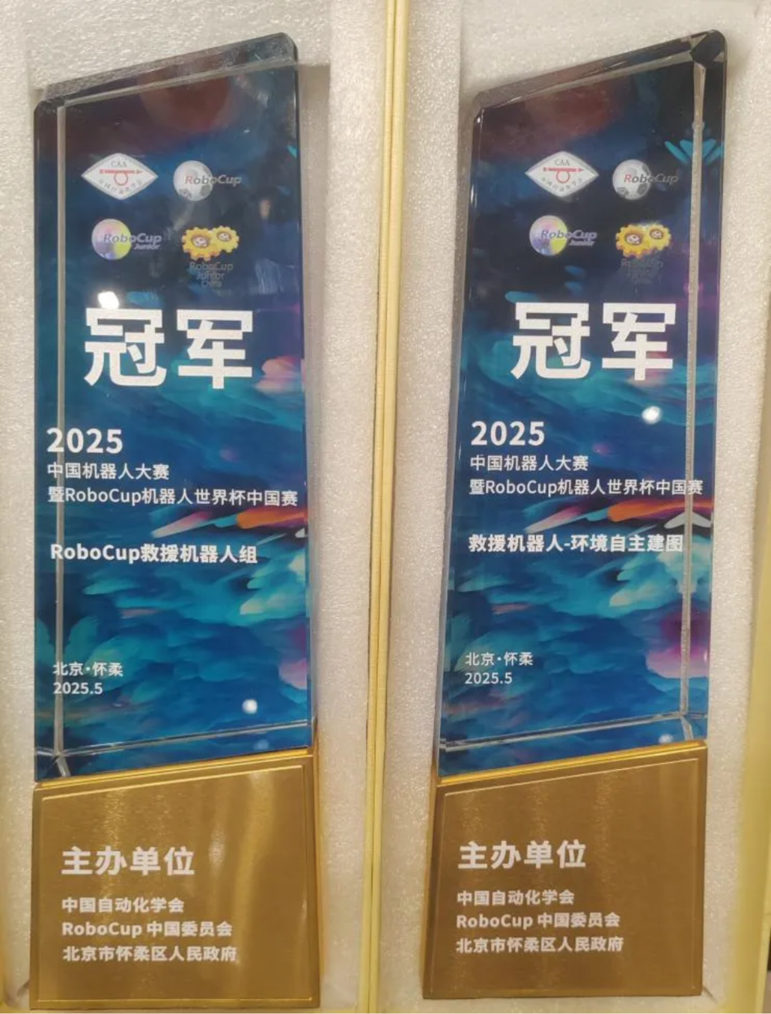 在赛程安排时间紧凑、任务繁忙的压力下,队员们团结协作、通宵达旦,秉承精益求精、永不言弃的拼搏精神,经历了电路板“七进七出”、各个单项连续比拼等重重考验,一路过关斩将,最终问鼎RoboCup救援机器人组赛项以及环境自主建图单项的双冠军,并成功斩获越障与搜救赛项的一等奖。