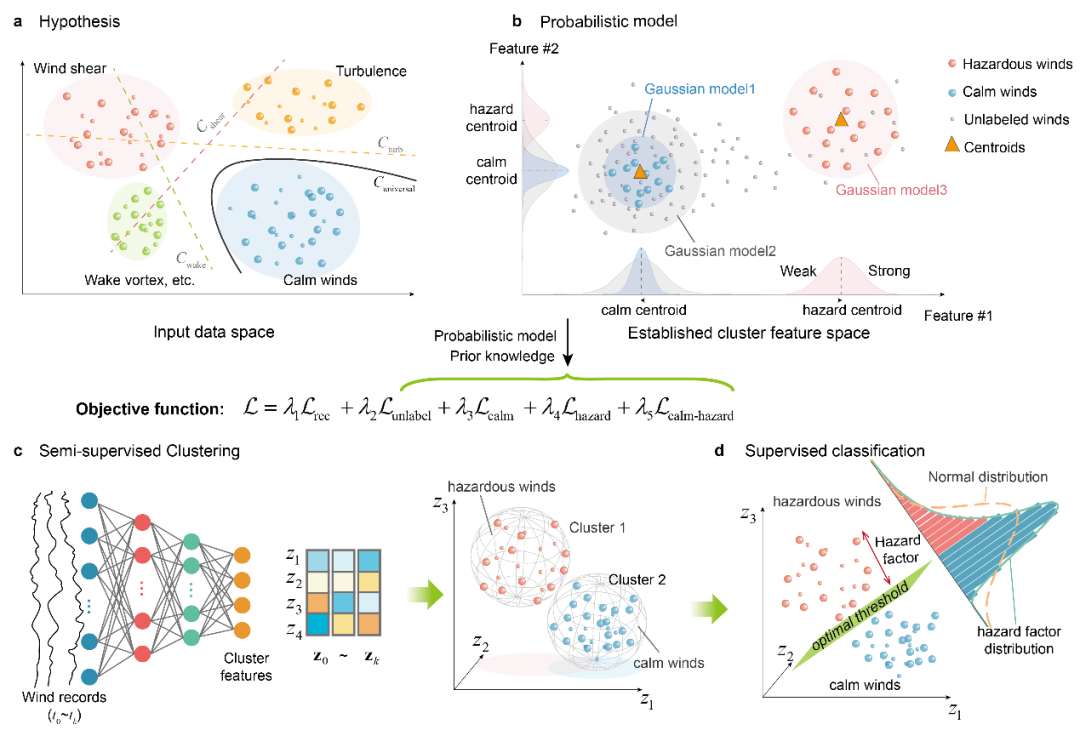 针对这一问题,Beat365唯一官方网站电子科学学院李健兵教授团队首创了一种基于可解释半监督聚类的低空风场航空危害综合评估方法,为提高航空安全保障水平提供了基础理论支撑。团队从风场空间非均匀性引发航空危害这一本质出发,结合风场物理先验知识和概率模型,提出了一种可解释半监督聚类的航空危害风场综合评估方法,在大量雷达探测数据和极少量标签数据的情况下,发现了低空风场航空危害的通用高维特征,首次实现了多种类型危害风场的高置信识别和量化评估。