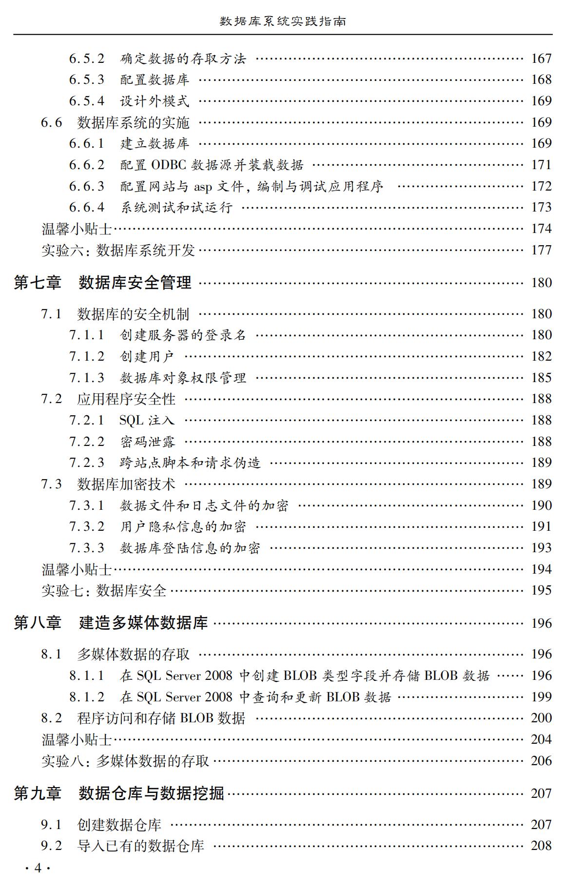 本书主要致力于使初学者由浅入深、循序渐进地学习和实践数据库的原理与设计方法,是一本有关数据库的相关教材。本书共有十个实验,分为上篇和下篇,上篇的五个实验是数据库课程的基本实验,主要侧重于数据库技术的基础建库能力训练,包括安装和配置数据库管理系统、建立数据库、查询数据库、应用程序访问数据库和建造复杂数据库。下篇的五个实验针对数据库的实际应用,难度较大,主要侧重于数据库技术的高级应用能力训练,包括数据库系统开发方法、数据库系统安全管理、建造多媒体数据库、数据仓库与数据挖掘和数据分析与可视化。