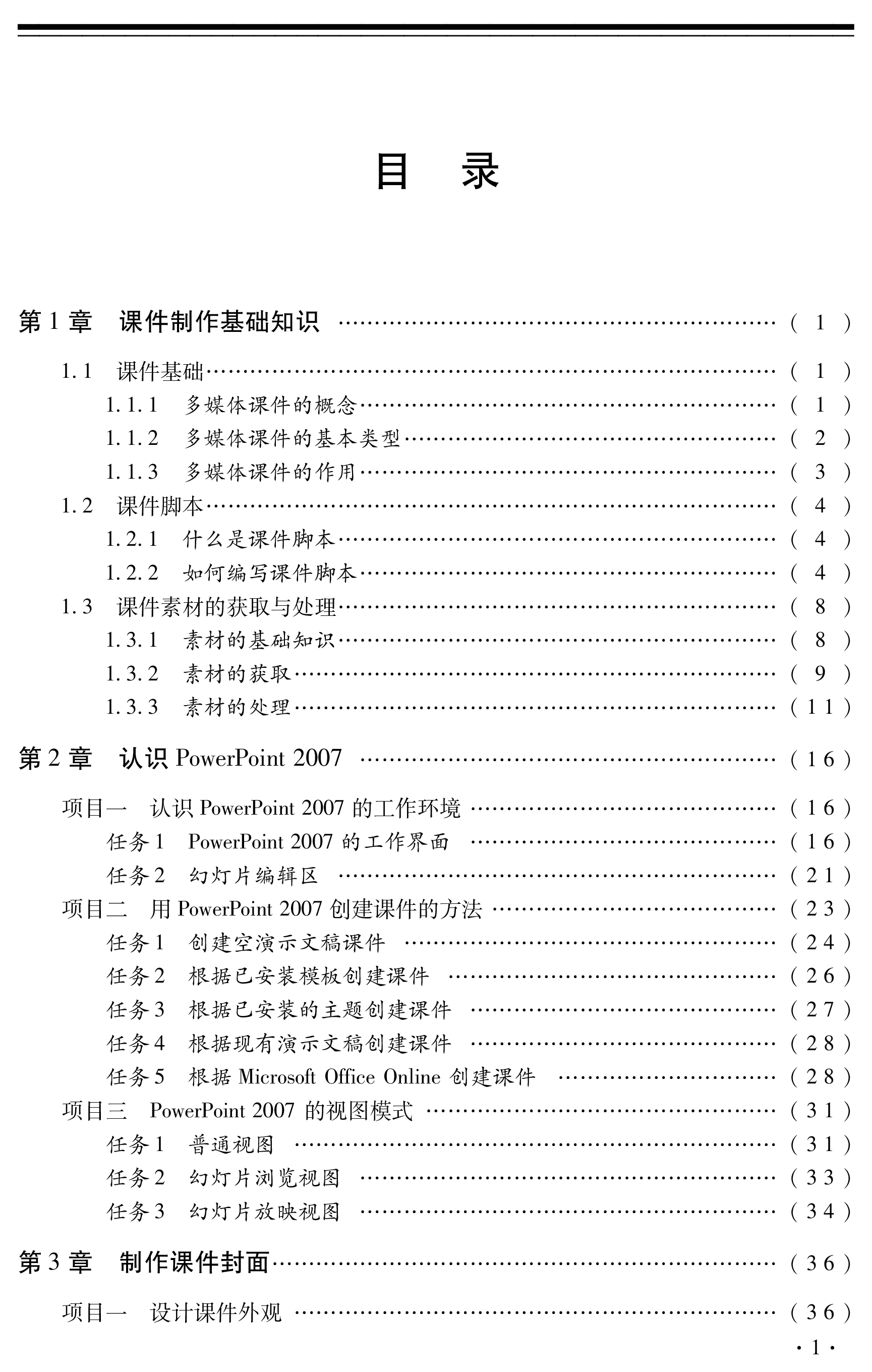 Power Point2007软件;第3~7章是课件制作的项目篇,通过具体项目,详细介绍了利用 Power Point 2007制作多媒体课件的方法与技巧;第8章是课件制作的实例篇,介绍了课件制作的设计思想、制作步骤与方法,为师范类院校学生在今后教学中使用多媒体课件提供指导。