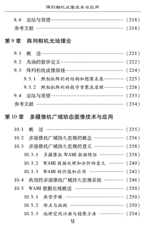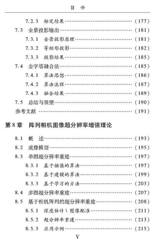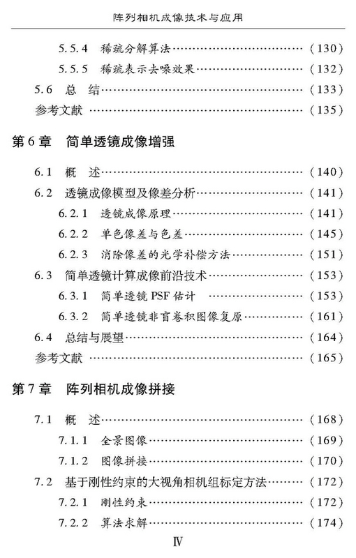 《阵列相机成像技术与应用》围绕阵列相机与多摄像机成像、图像处理和视觉计算等方面进行介绍,总结了作者在此领域的一些工作。全书可分为三部分,共11章。一部分为基础理论,包括第1章至第3章,其中第1章概述了阵列相机与多摄像相关典型系统和应用;第2章介绍摄像机标定方法;第3章介绍立体视觉和多视图相关理论和方法。第二部分为图像增强,主要关注于单摄像机图像增强以及基于多幅图像的相关计算方法,包括第4章至第9章,其中第4章介绍了图像去模糊方法;第5章介绍了图像去噪方法;第6章介绍了简单透镜成像增强方法;第7章介绍了图像拼接方法;第8章介绍图像超分辨率增强方法;第9章介绍了光场计算方法。第三部分为系统和应用,包括第10章至第11章,其中第10章介绍了多摄像机广域动态图像技术与应用;第11章介绍了多摄像机情形下人体姿态估计和跟踪技术。