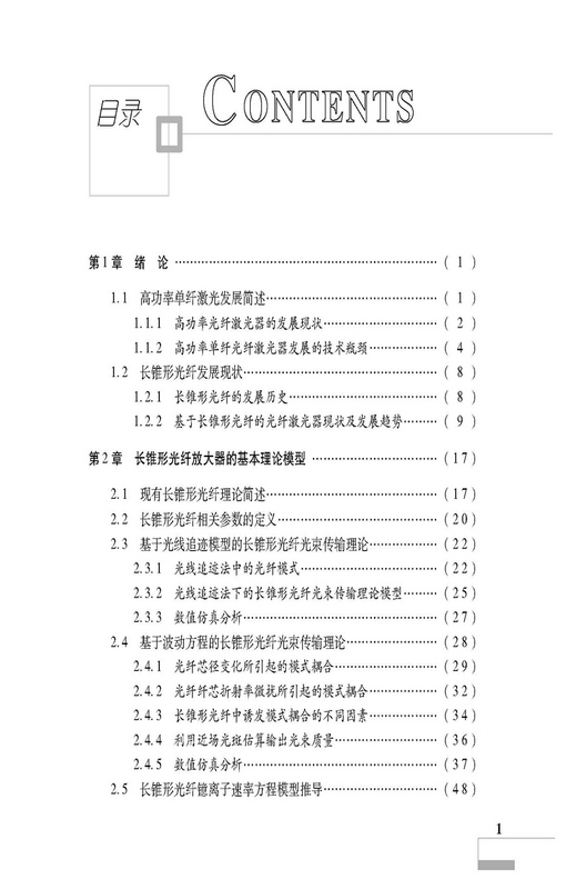 本书以长锥形掺镱光纤放大器为研究对象,阐述了高能激光技术中基于锥形增益光纤的高功率光纤激光放大器技术。首先回顾了光纤激光的发展历史以及锥形光纤的研究历程,然后分别基于光线追迹法和特征模式分解法推导了长锥形光纤中的模式耦合理论,并利用非线性薛定谔方程对长锥形光纤中的受激拉曼散射和受激布里渊散射进行了理论建模和仿真,利用速率方程和稳态热传导方程对长锥形光纤中的热致模式不稳定效应开展了理论研究,介绍了长锥形光纤放大器的典型实验结果。