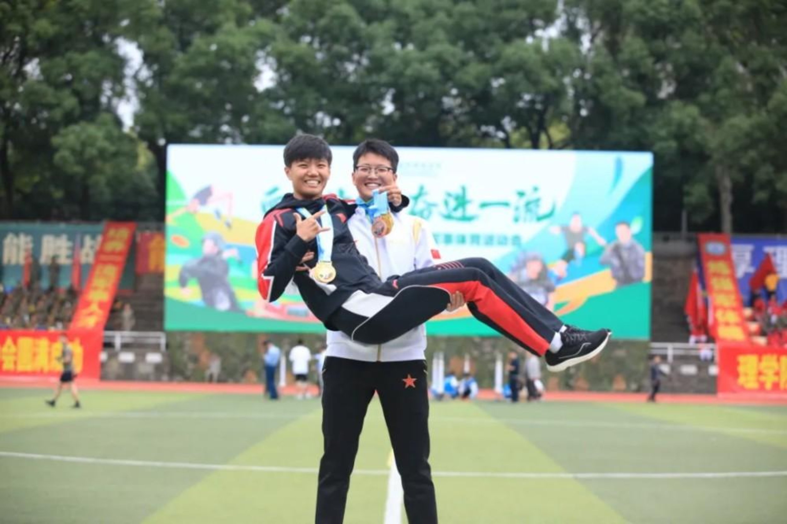 “卢教员又‘卷’赢了!”学校军事体育运动会教职工组百米赛道上,场边的学员们对刷新了学校纪录的“卢教员”举着横幅喊“YYDS”,她抹着汗笑:“下节课体能打卡,都别掉队啊!”