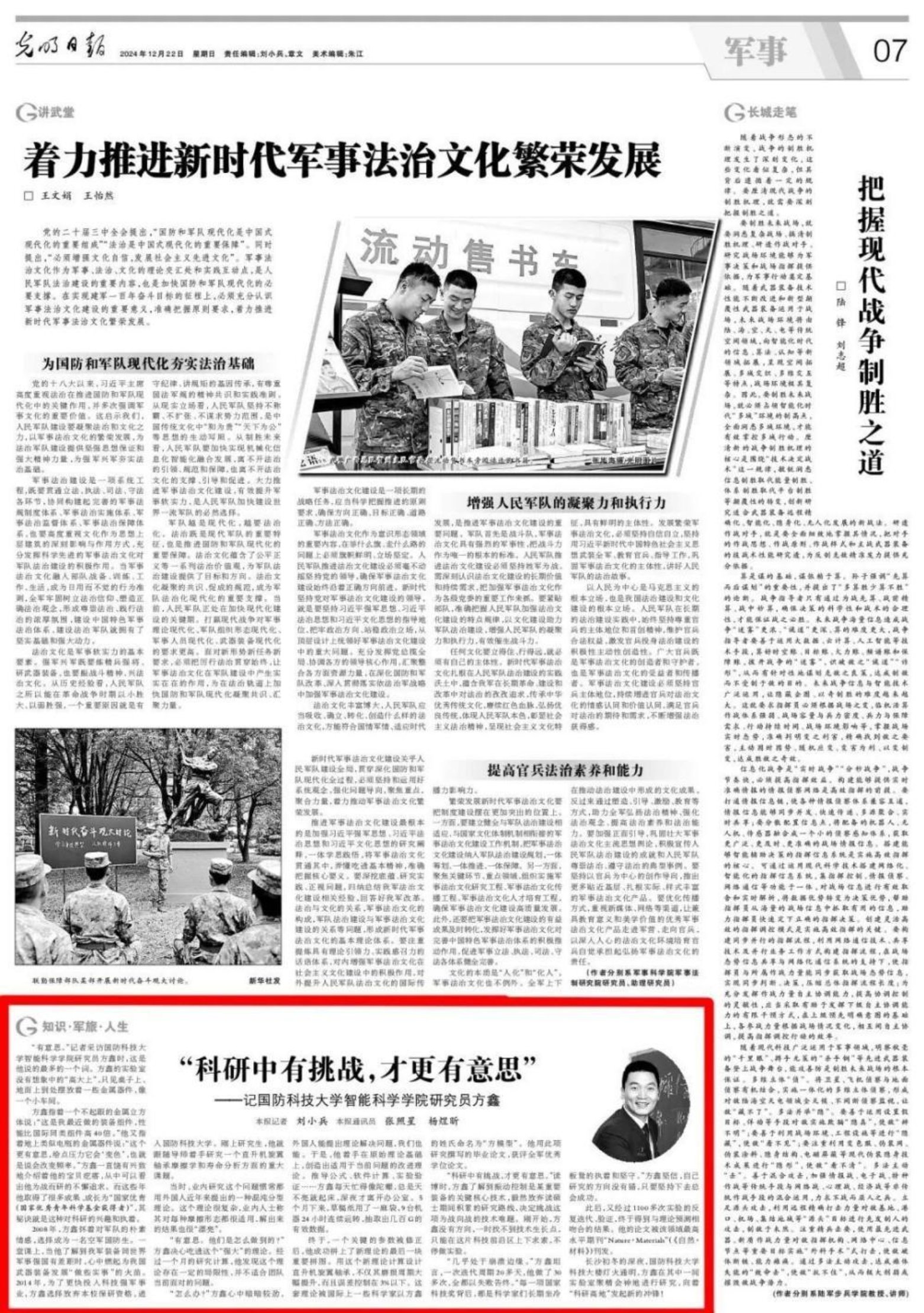 方鑫指着一个不起眼的金属立方体说:“这是我最近做的装备组件,性能比国际同类组件高40倍。”他又指着地上类似电瓶的金属器件说:“这个更有意思,给点压力它会‘变色’,也就是说会改变频率。”方鑫一直饶有兴致地介绍着他的宝贝疙瘩,从中可以看出他为战而研的不懈追求。而这些年他取得了很多成果、成长为“国家优青(国家优秀青年科学基金获得者)”,其秘诀就是这种对科研的兴趣和执着。