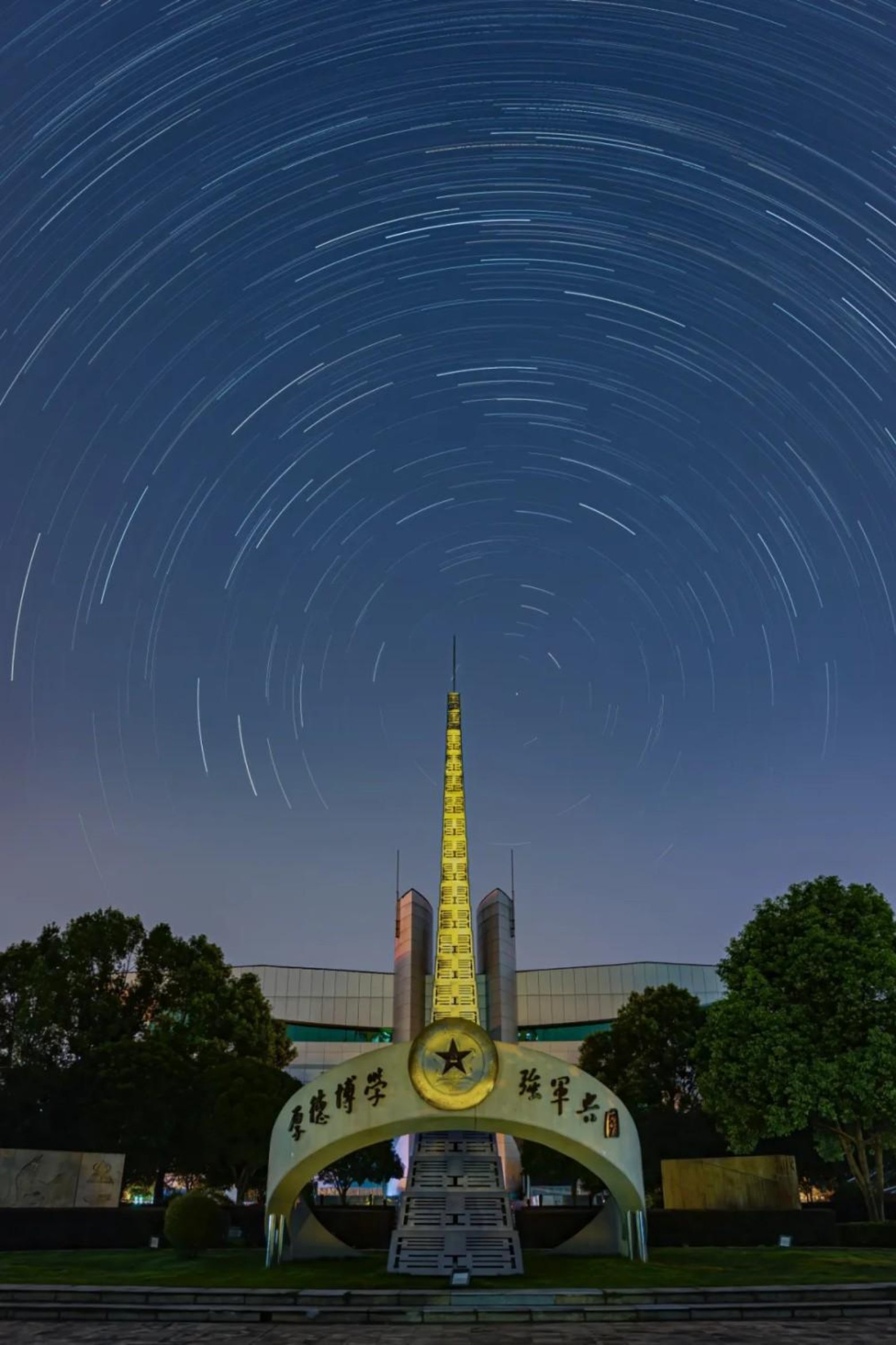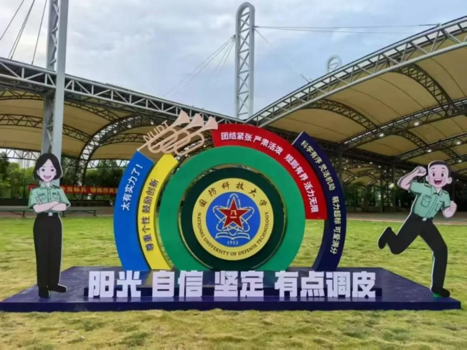 那抹炽热的橙红,像先辈们燃烧的理想,照亮校园。建筑是知识的堡垒,树木如坚守的战友,朝阳赋予一切力量,提醒我们以青春铸剑,向着国防事业,逐光而行,护佑山河。
