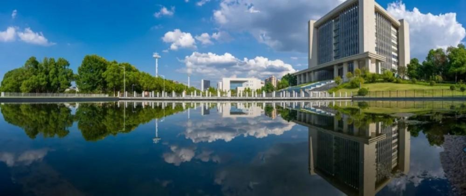 蓝天白云下,校园风景如画。澄澈湖水如镜,将教学楼、绿树、云朵一一揽入怀中,倒影与实景交融,勾勒出宁静而美好的校园景致,尽显校园独特韵味。