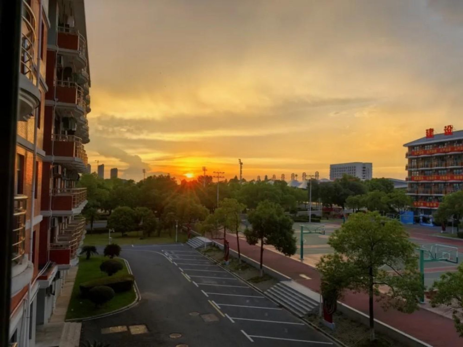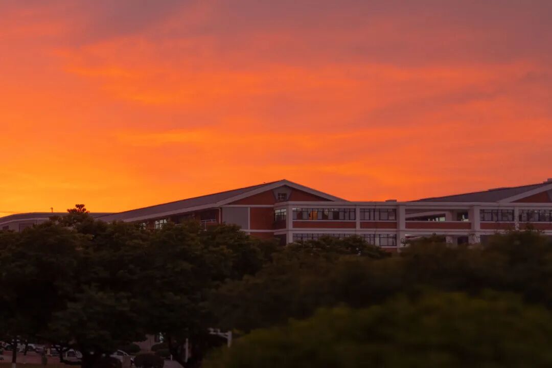 “落日熔金,暮云合璧。”此刻,校园被柔和霞光笼罩,似展开的诗意长卷。远处建筑在金霞勾勒下,轮廓清晰,尽显自然与建筑艺术交融之美。置身这绚烂霞光中,学习与训练带来的疲惫瞬间消散,唯余满心的惬意与舒畅。