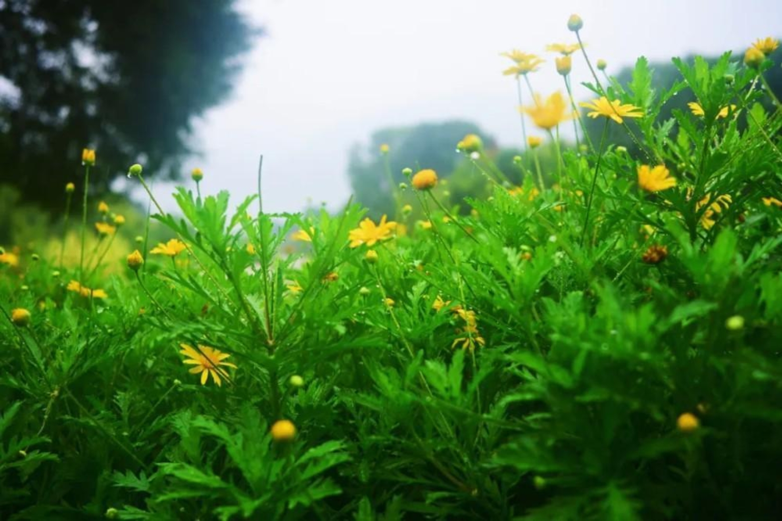 雾气朦胧的天,黄花在绿海里闪烁,像揉碎的阳光落进来。在潮湿的空气里,片片小黄花肆意生长,雨滴挂在花瓣,像未干的泪,却又透着倔强,它们从不抱怨环境,只知使劲开花,即使长在无人浇灌的角落,却依旧蓬勃。