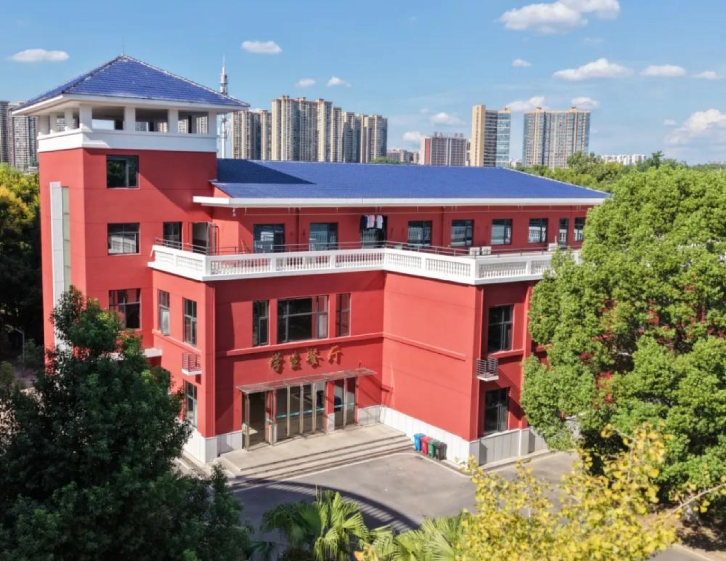 新的学生餐厅,在绿树与蓝天映衬下,既具活力又显雅致,为学生打造出舒适宜人的就餐空间,承载着校园生活的烟火与美好期许。