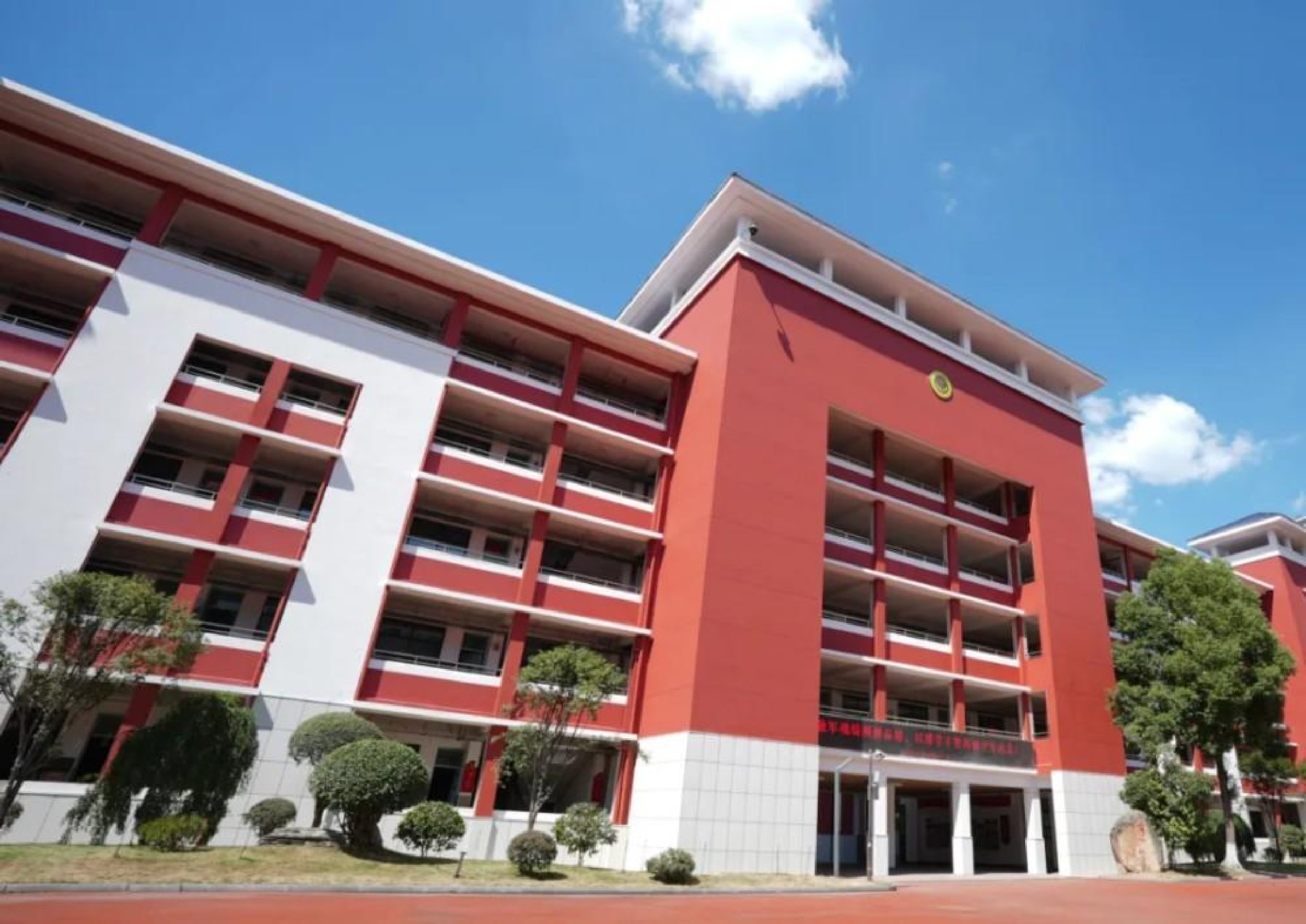 蓝天为幕,白云作缀,阳光倾洒在焕新的附中教学楼。红与白的色彩搭配鲜明亮眼,周围绿植点缀,营造出充满活力与希望的校园意境,尽显新貌生机。