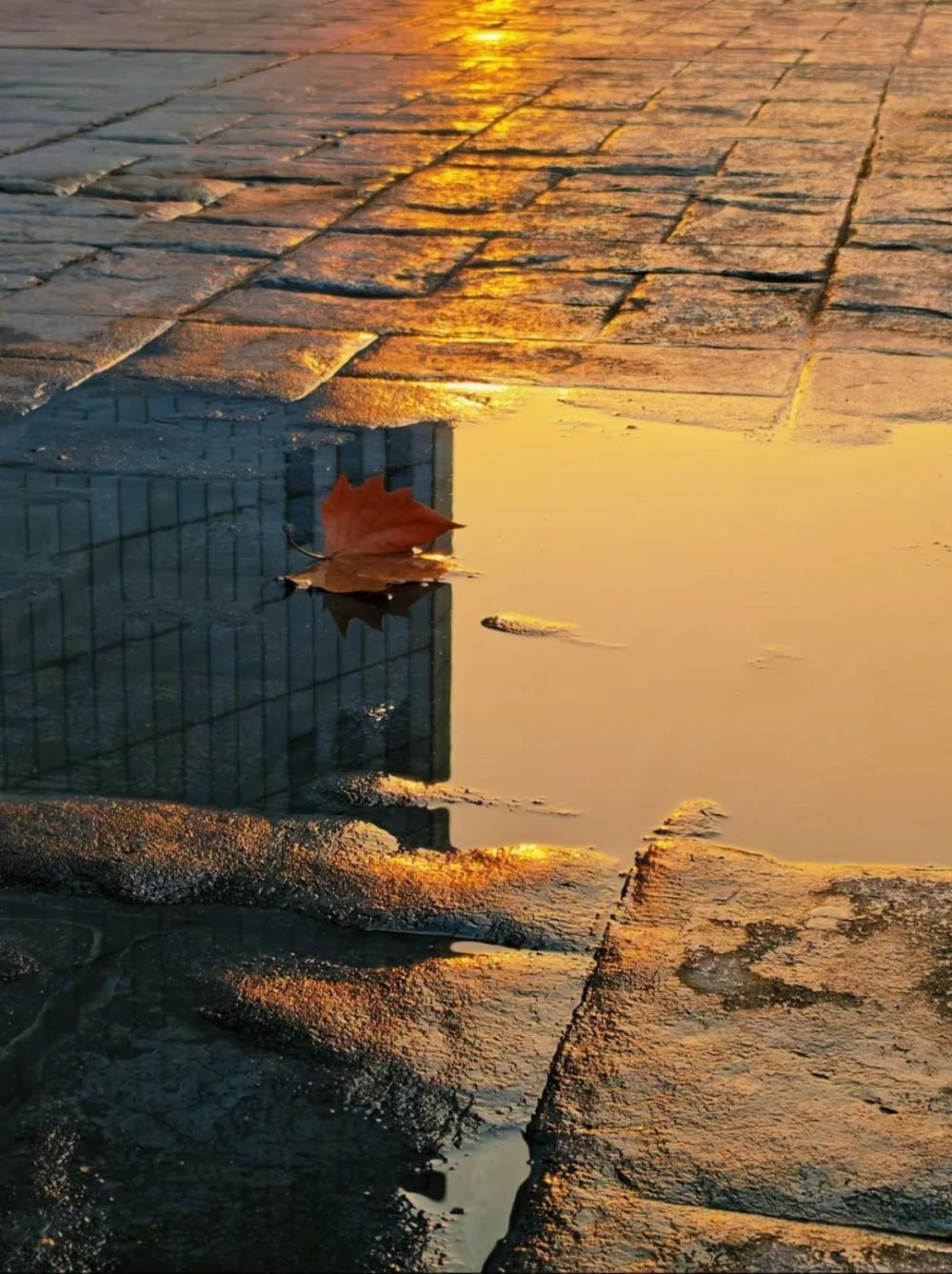 秋阳倾洒科大砖石路,积雨成镜,映出建筑的棱线与落日鎏金。一片红叶栖于水间,是季节的信笺,也是校园里细碎的温柔——时光在此沉淀,将日常的角落,晕染成独属于科大的秋日诗行。
