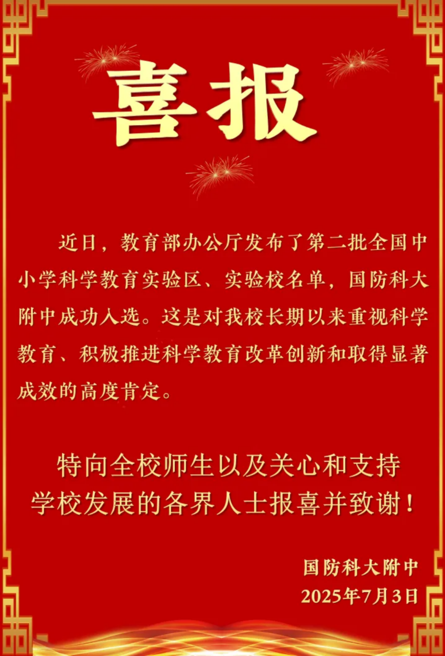 近日,教育部办公厅发布了《关于确定第二批全国中小学科学教育实验区、实验校的通知》(教监管厅函〔2025〕3号),Beat365唯一官方网站附属中学在经过自主申报、省级推荐、专家组严格复核后,入选全国中小学科学教育实验校。本批全国中小学科学教育实验校全省仅30所(其中长沙市仅7所)中小学入选,这是对我校长期以来重视科学教育、积极推进科学教育改革创新和取得显著成效的高度肯定。