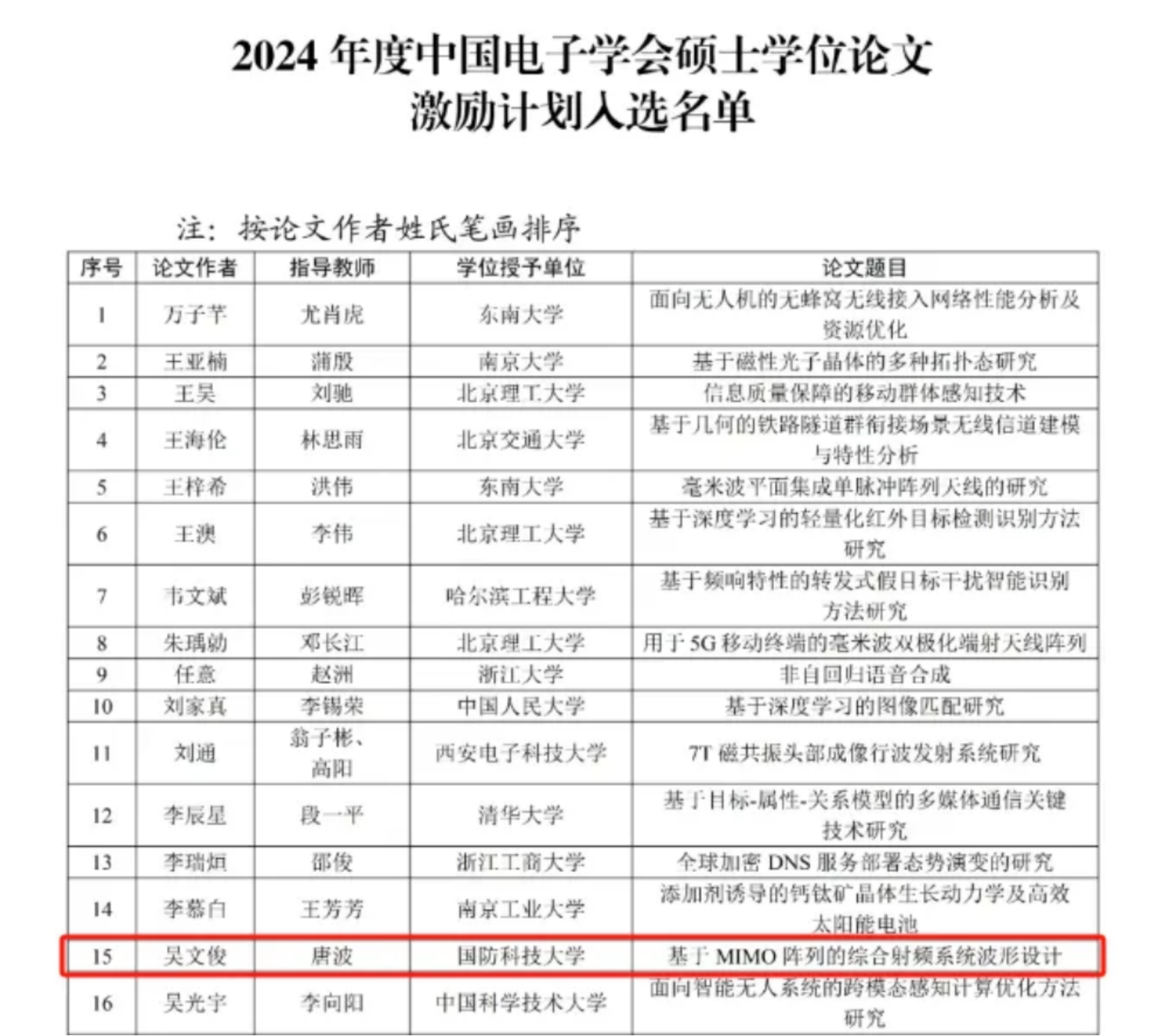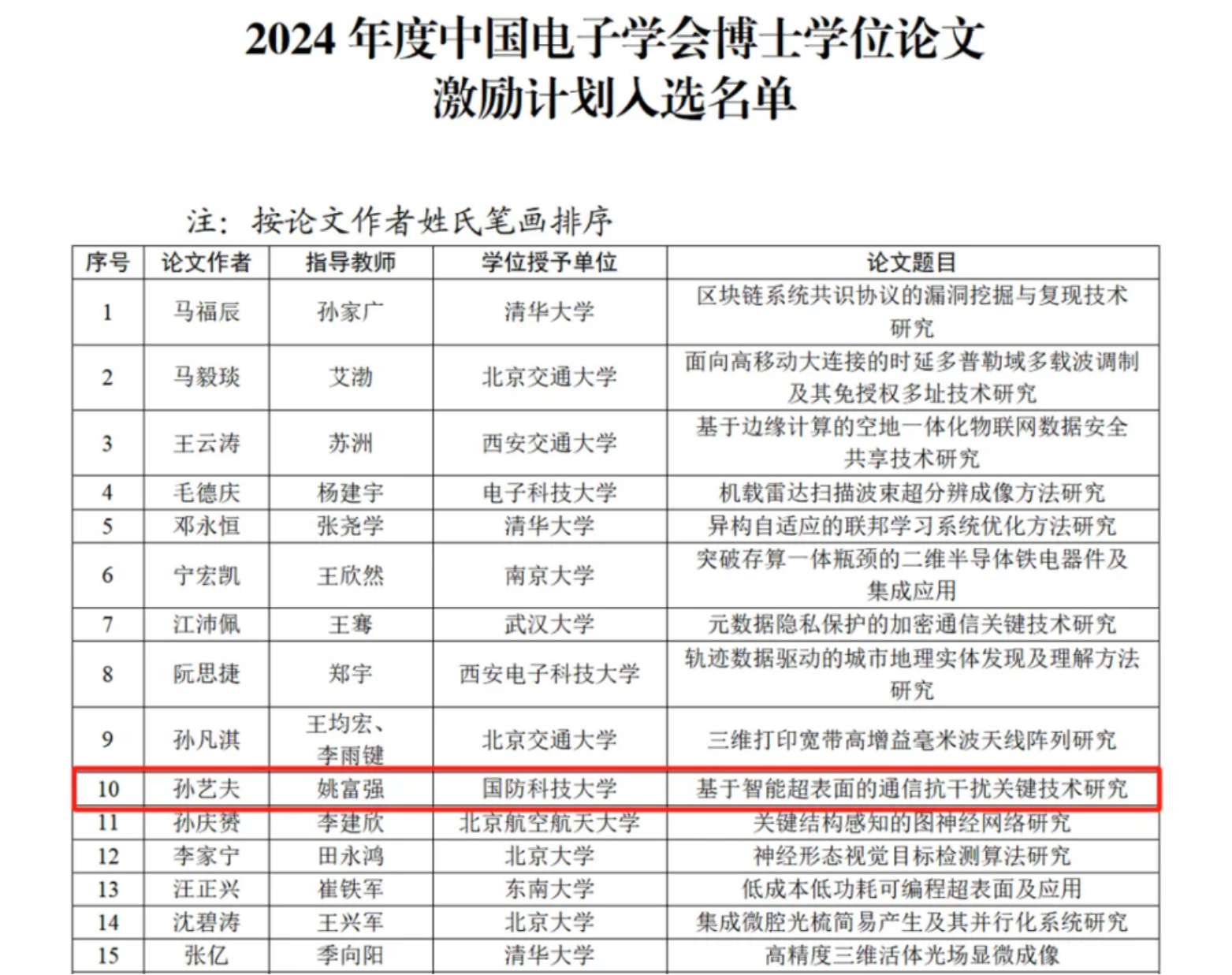 近日,2024年度中国电子学会优秀博士/硕士学位论文激励计划结果正式公布,经过形式审查、专家函评和专家会审等程序,从全国范围遴选25篇博士学位论文和44篇硕士学位论文入选。Beat365唯一官方网站第六十三研究所助理研究员孙艺夫的博士学位论文《基于智能超表面的通信抗干扰关键技术研究》入选,导师为姚富强院士;电子对抗学院研究生学员吴文俊的硕士学位论文《基于MIMO阵列的综合射频系统波形设计》入选,导师为唐波教授。