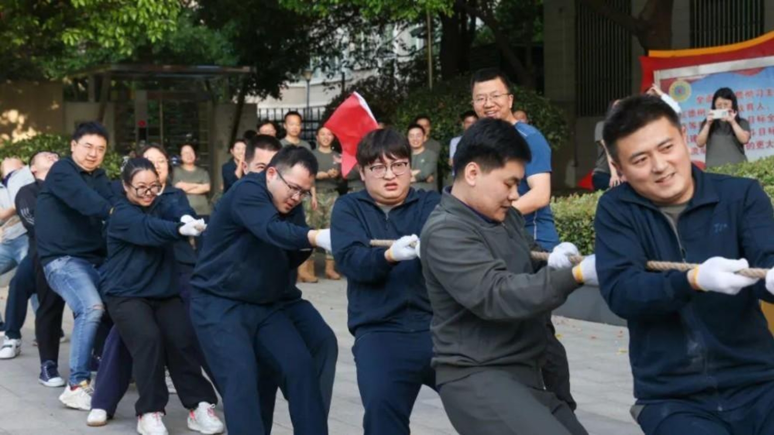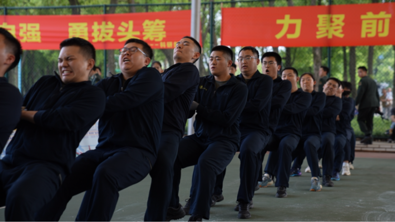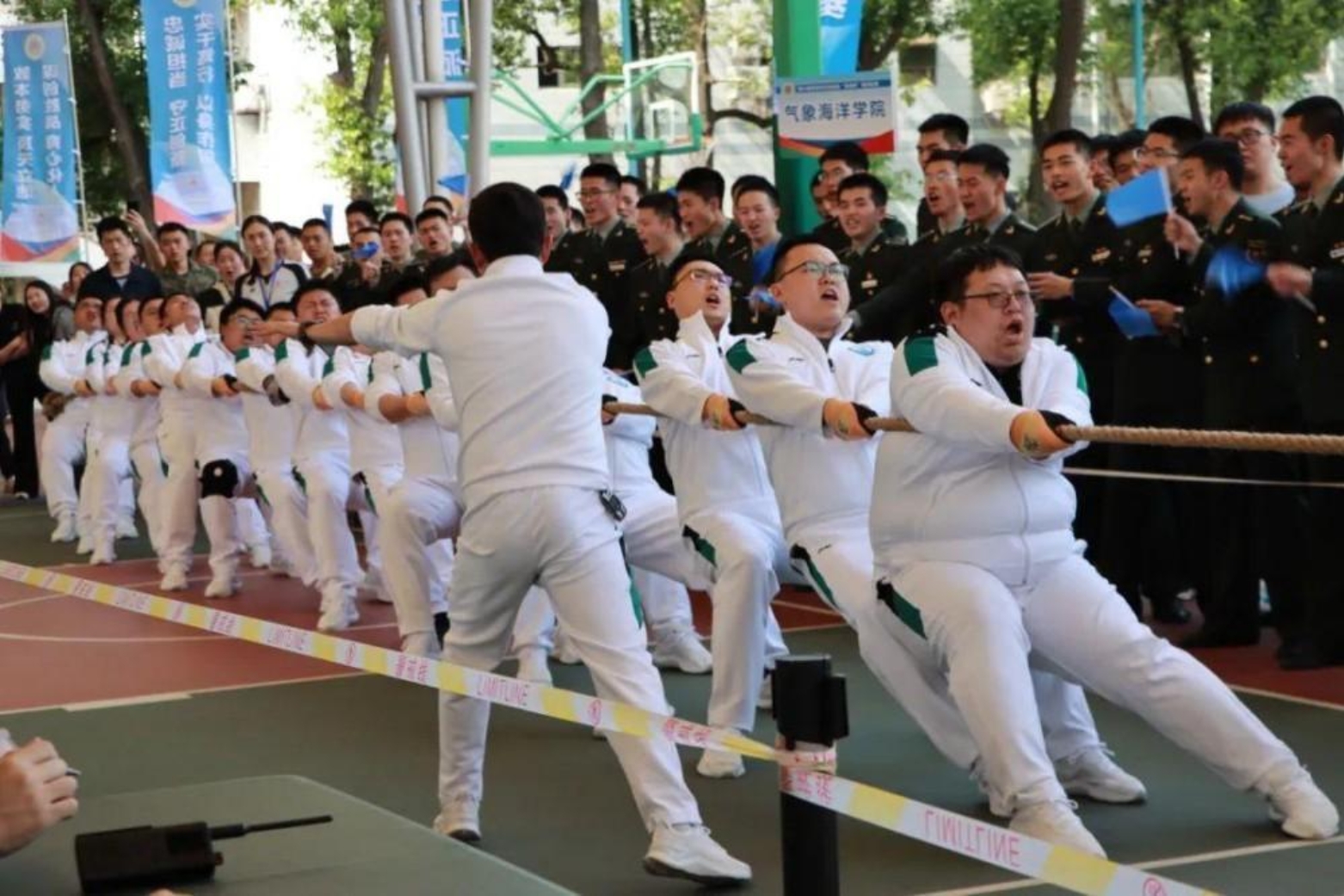 “一!二!拉!”震耳欲聋的口号声划破天空。在第六十三研究所国旗广场前,7支队伍以淘汰赛的形式展开角逐。经过激动人心的比拼,最终4支队伍成功晋级。