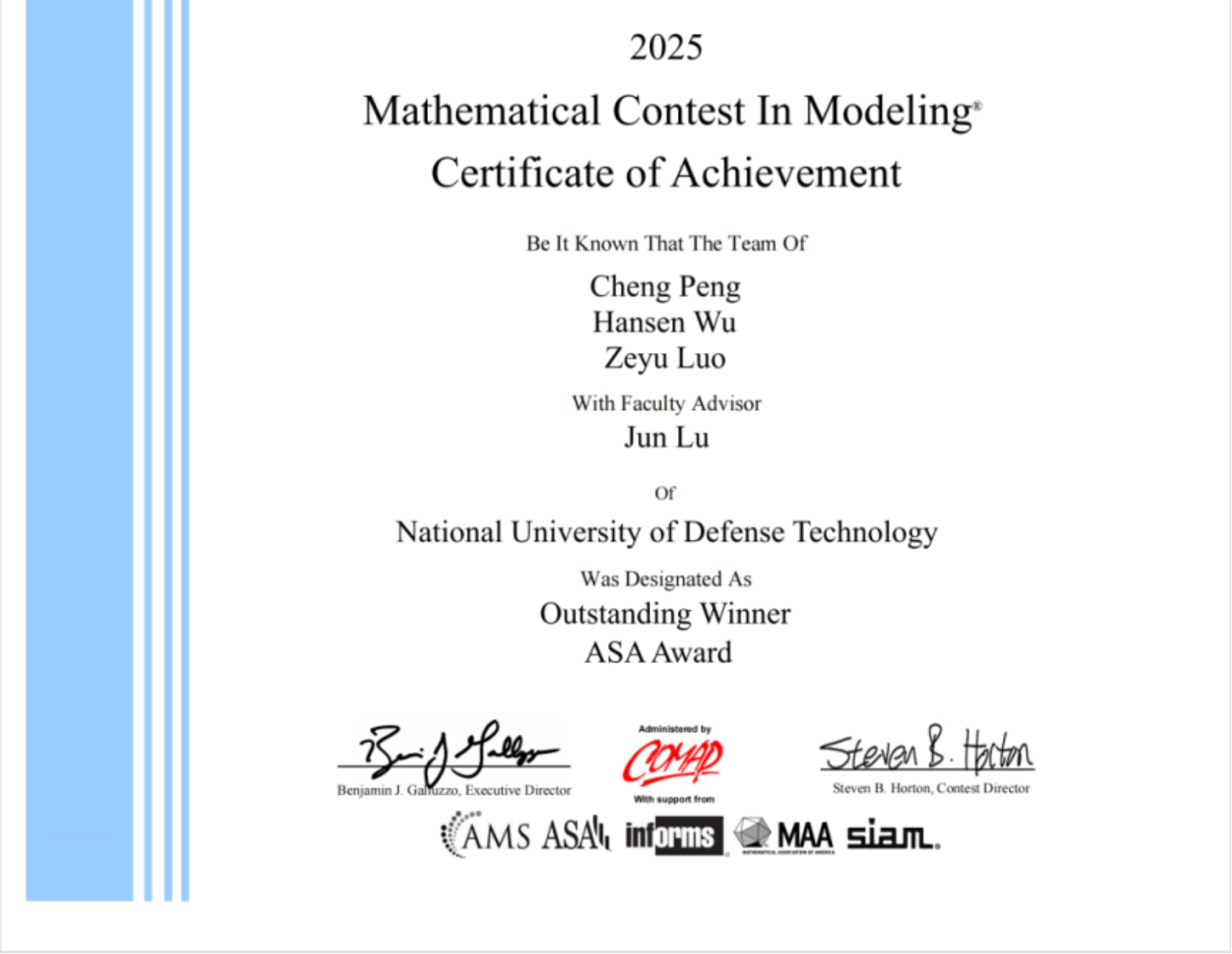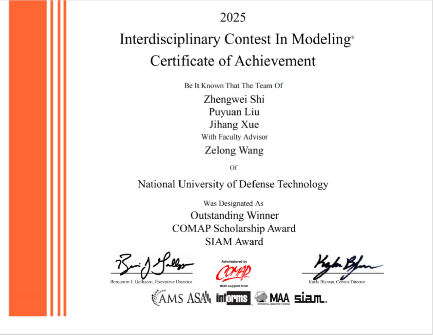 来自系统工程学院本科学员石正玮、刘濮源和电子对抗学院本科学员薛霁航组成的团队,在理学院王泽龙教员的指导下斩获特等奖和美国工业与应用数学学会(SIAM)冠名奖;来自军政基础教育学院本科学员彭城、吴瀚森和理学院钱学森拓展班本科学员罗泽宇组成的团队,在理学院陆军教员的指导下,斩获特等奖和美国统计学会(ASA)冠名奖,这是我校首获该学会的冠名奖。同时,我校学员还在该项赛事中获得8项特等奖提名奖、21项一等奖,获奖成绩位列全球参赛高校前列。