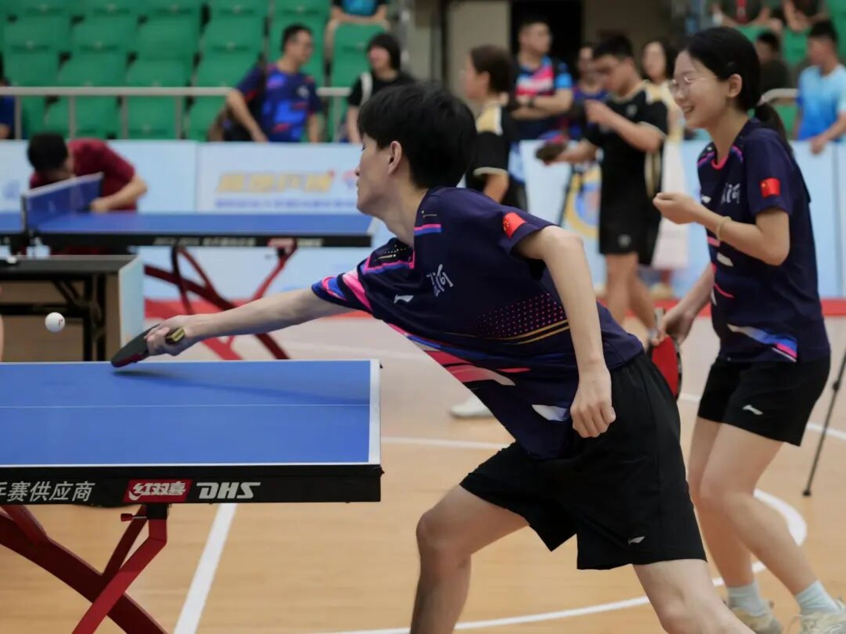 接下来,教工组、学员组单项赛、混双赛火热开赛。随着裁判一声令下,双方运动员迅速进入状态,乒乓球在球台上来回穿梭,划出白色的弧线,选手们身姿矫健,或下蹲蓄力、或腾空扣杀,球拍与球碰撞的脆响此起彼伏,双方攻防转换间尽显战术博弈。观众席上掌声、欢呼声此起彼伏,现场热烈氛围将竞技体育的魅力展现得淋漓尽致。