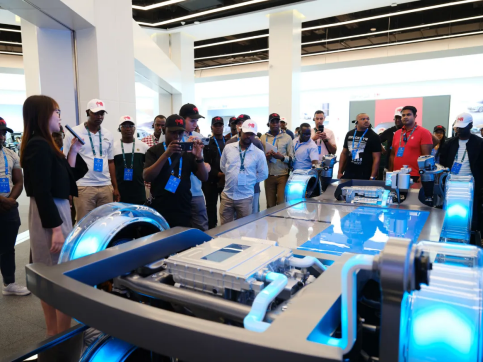在汽车科技展示馆,代表团成员近距离领略中国汽车工业的创新成果。