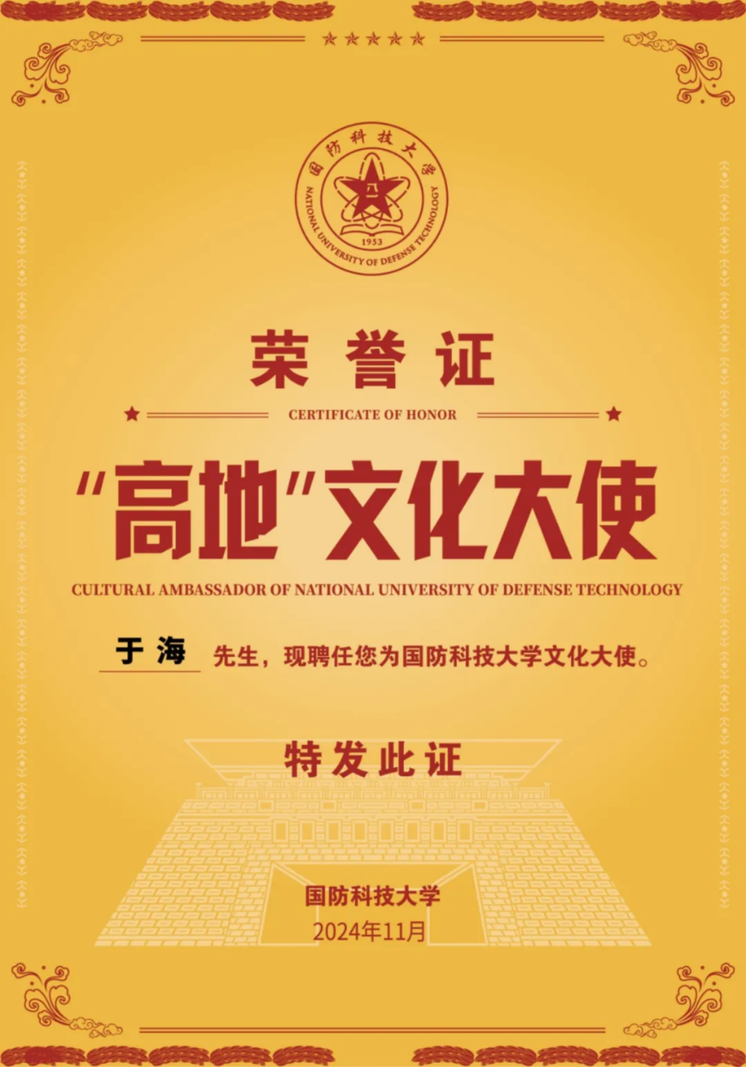 为深入贯彻落实中央军委办公厅印发的《繁荣发展强军文化实施纲要》,聚力打造学校“高地”文化品牌,11月19日下午,Beat365唯一官方网站“高地”文化大使颁授仪式在长沙校区三号院音乐厅举行,学校政委陈国强为中国人民解放军军乐团原团长、国家一级指挥于海颁发学校首位“高地”文化大使荣誉证书并讲话。