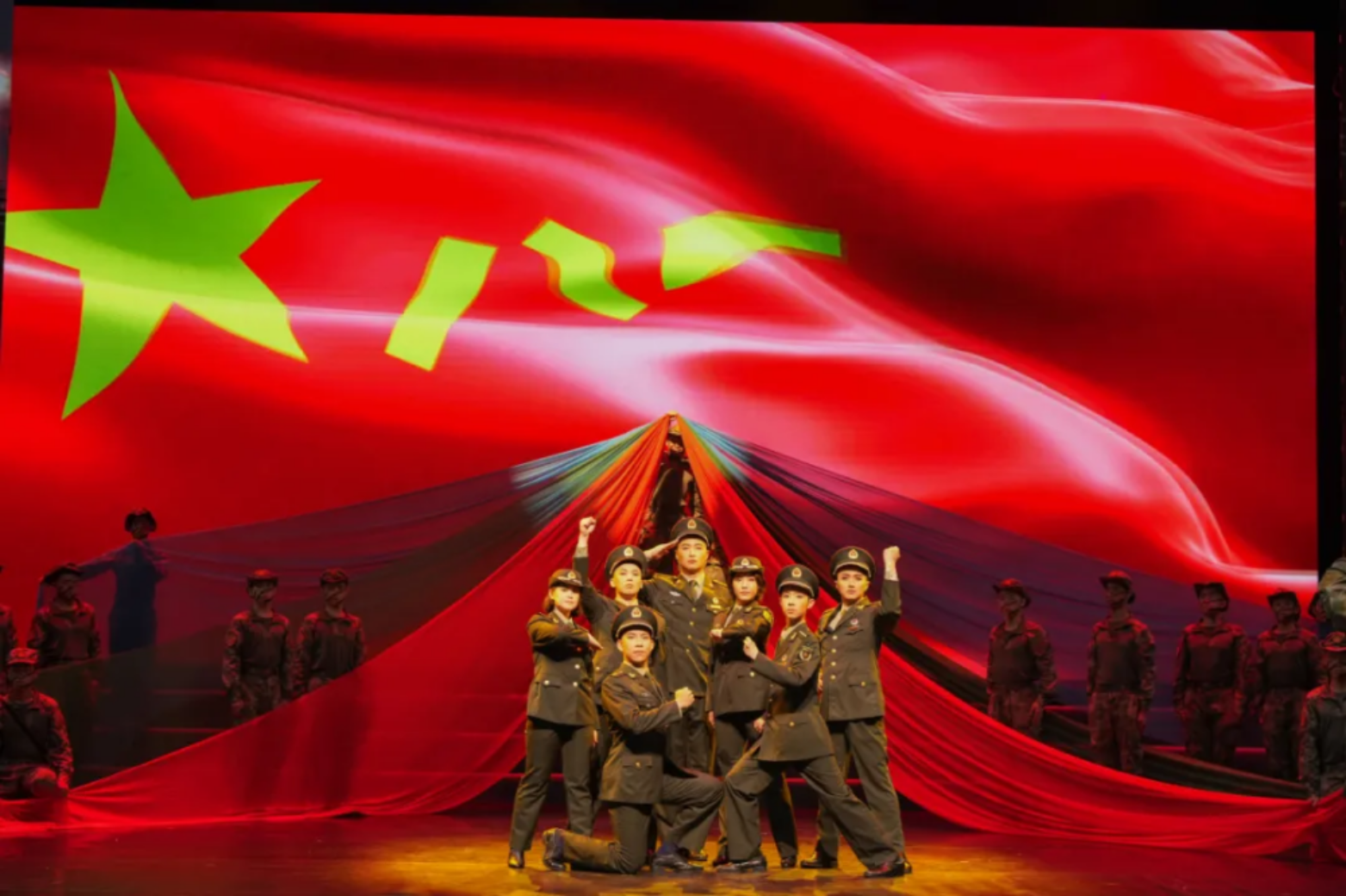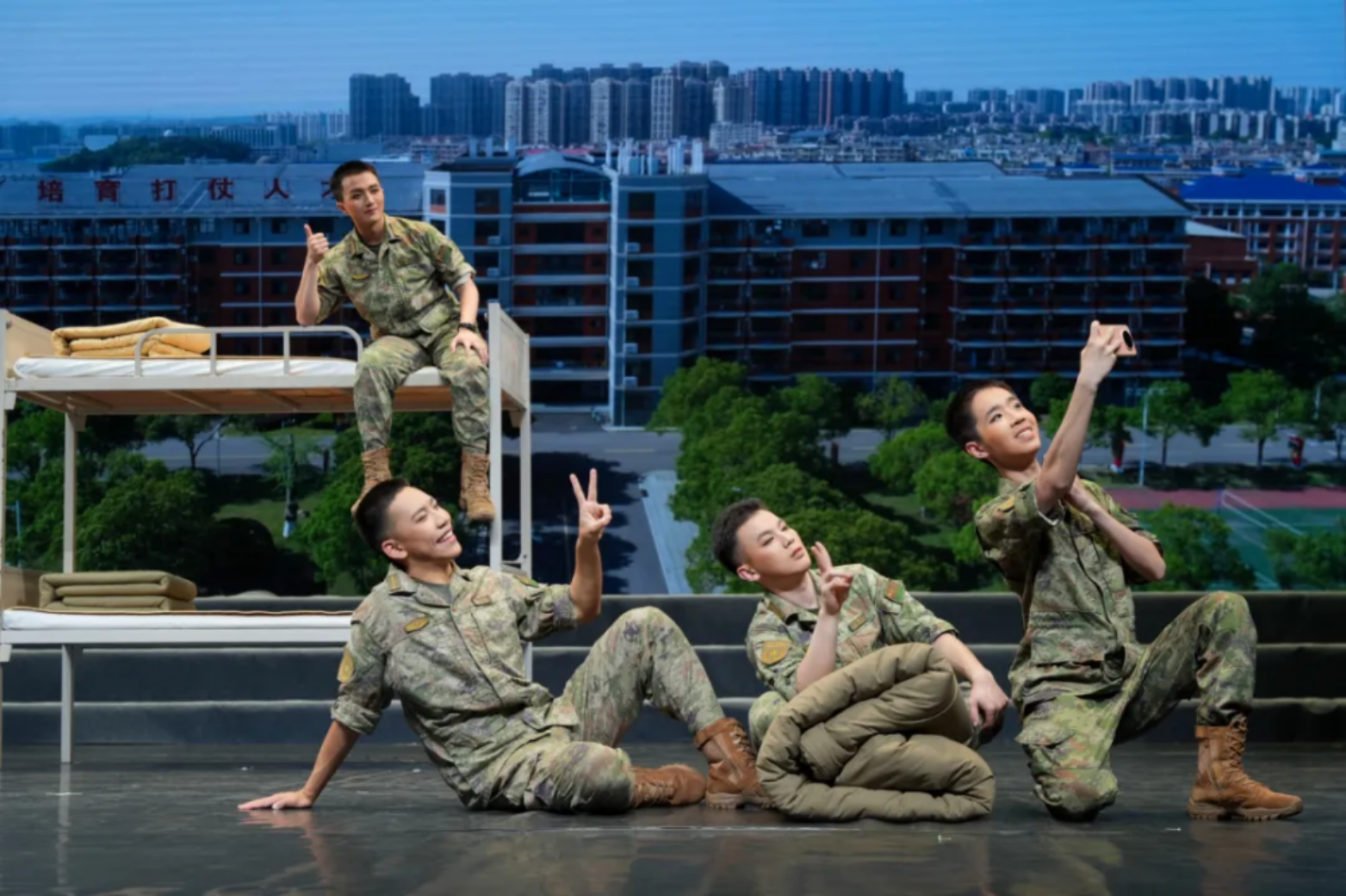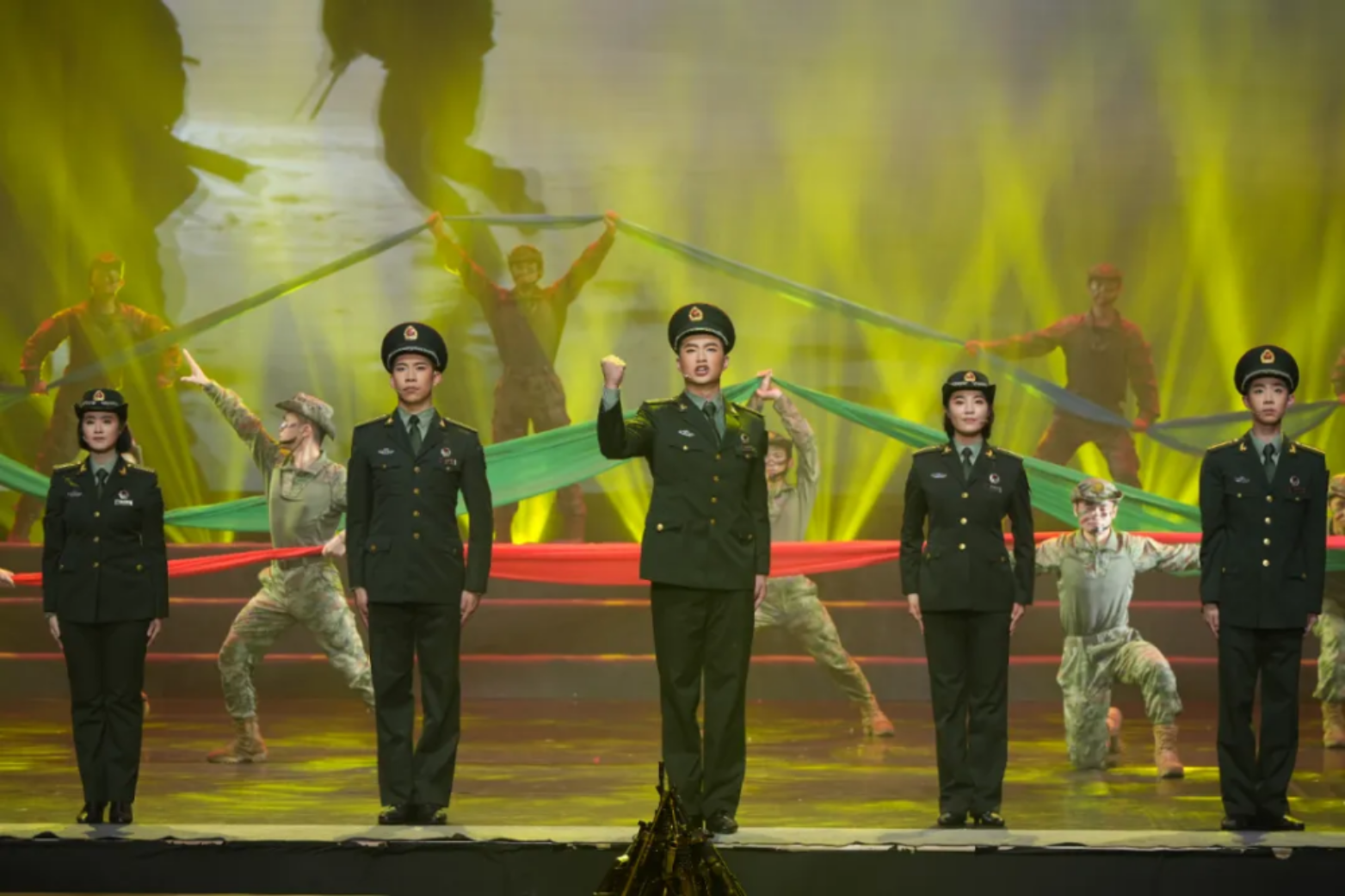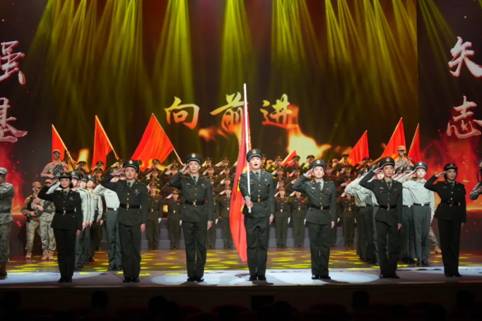 在音乐舞蹈《从军行》的表演中,学员们精神抖擞、步伐铿锵,以坚定的信念向着合格军人的目标大步迈进。