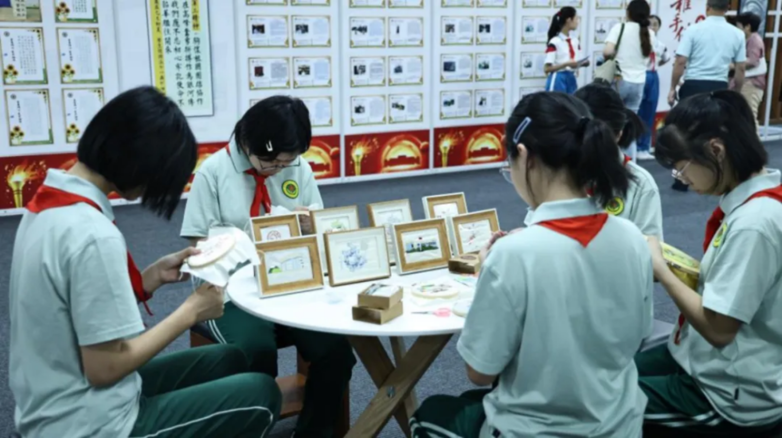 展览形式丰富多彩,融合文稿展示、光影印记、时光胶囊、数字化呈现等多种要素。在展厅中央,附中和附小的同学们带来了湘绣与剪纸作品的展示,并与观展者积极互动。观众们深受触动,在留言区写下对于传承弘扬“哈军工”精神的寄语。